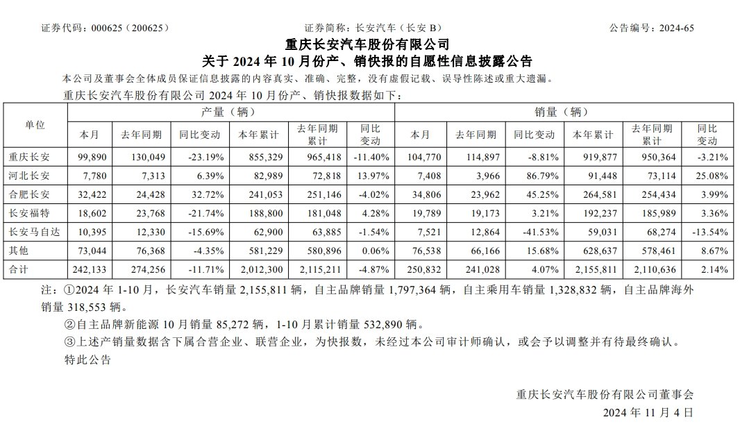 经历了“四连降”之后,长安汽车10月销量迎来反弹。近日,长安汽车发布产销快报显示,公司10月销量为25.08万辆,同比增长4.07%;其中自主品牌新能源销量8.53万辆,同比增长48.6%。由此,外界对其全年能否完成280万辆 ...