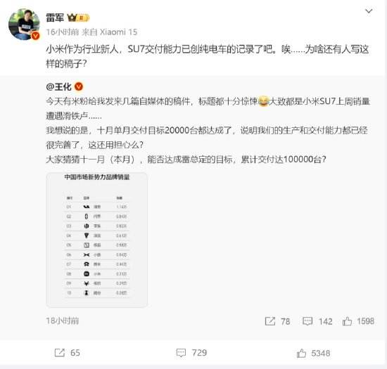 同辰科技讯 11月8日下午消息,近日,小米集团公关部总经理@王化 在微博发文称,“今天有米粉给我发来几篇自媒体的稿件,标题都十分惊悚。大致都是小米SU7上周销量遭遇滑铁卢……我想说的是,十月单月交付目标20000台都达成了,说明我们的生产和交付能力都已经很完善了,这还用担心么?大家猜猜十一月(本月),能否达成雷总定的目标,累计交付达100000台? ” 小米集团董事长@雷军 也转发该微博表示,“小米作为行业新人,SU7交付能力已创纯电车的记录了吧。唉……为啥还有人写这样的稿子?”