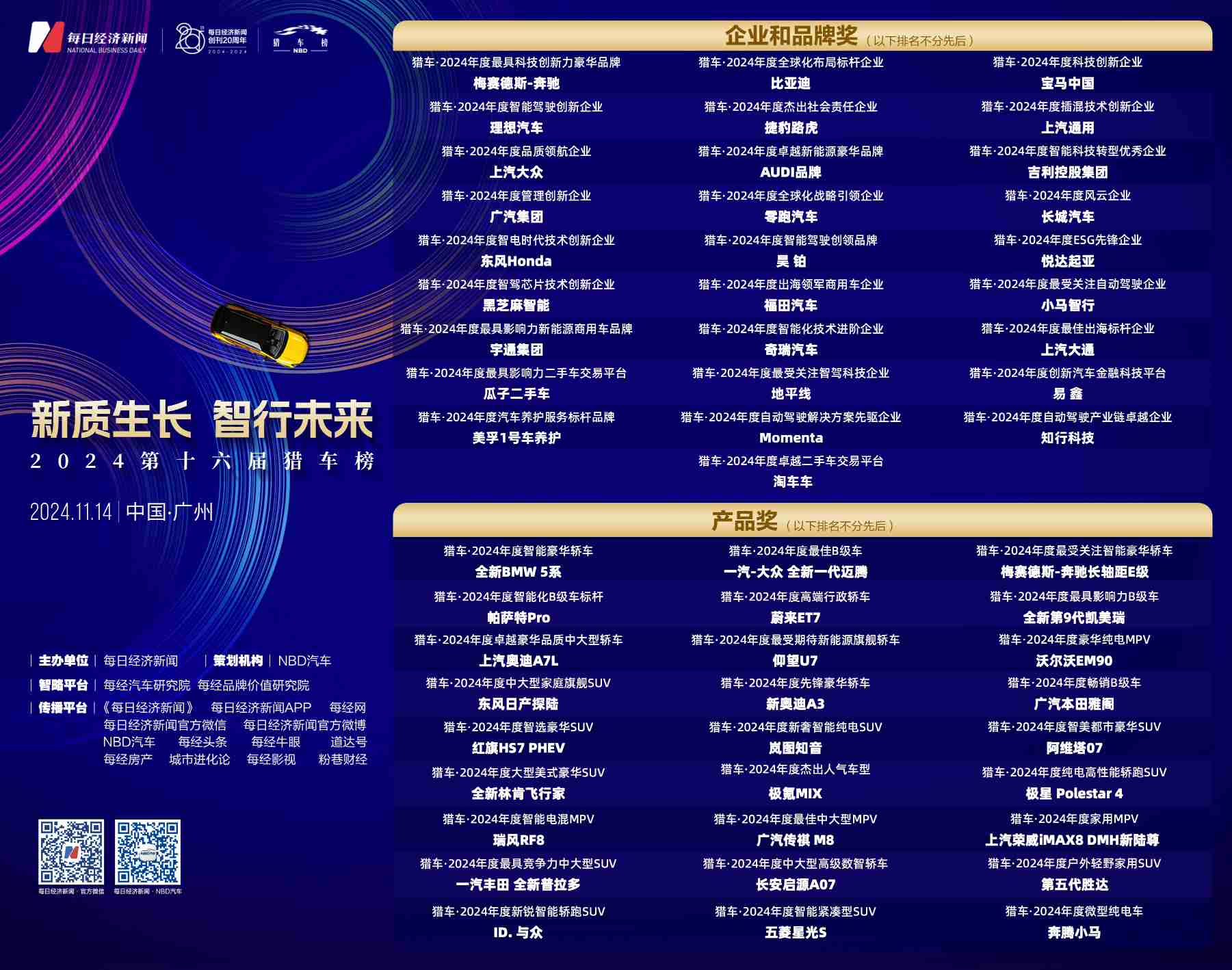 11月14日,第十六届猎车榜启幕。55个重磅奖项揭晓第十六届猎车榜共诞生企业和品牌奖28个,产品奖27个。其中,梅赛德斯-奔驰、宝马中国、昊铂、上汽大众、捷豹路虎、零跑汽车、比亚迪等28家企业和品牌分别获得猎车・2 ...
