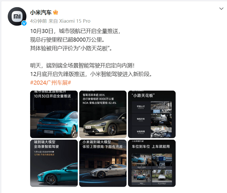 每经AI快讯,11月15日,小米汽车在其官方微博宣布,端到端全场景智能驾驶明日开启定向内测。