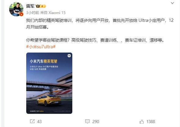 雷军将推出小米“驾校”一事再有新进展。 11月16日上午,小米集团董事长兼CEO雷军在微博发文称,我们内部的精英驾驶培训,将逐步向用户开放,首批先开放给Ultra小定用户,12月开始招募。你希望学哪些驾驶课程?高级驾驶技巧、赛道训练、赛车证培训、漂移等。 实际上,此前的11月5日,#雷军称将推出小米驾校#登上微博热搜,引起网友热议。 5日晚,小米集团公关部总经理王化表示:“雷总最近在发布会和直播中确有提到,未来将考虑对我们的车主朋友们开放小米公司内部的高级驾驶培训、赛道驾驶培训、漂移培训三类课程。据我所了解,目前并没有制订培训费用的具体金额,也和媒体报道的某驾校APP无关,请大家知悉。” 据公开资料,“雷军称将推出小米驾校”的消息起源于近日的一次小米发布会中。当时,雷军称“要推出小米驾校供大家学习”。他表示:“我们很多人拿到驾照以后,其实不是真的会开车。所以我们有高级驾驶培训,有赛道驾驶培训,有漂移培训,到时候会把它开放给我们的车主朋友们,让大家都有机会接受好的培训。” 11月5日,多家媒体报道称:“据悉,小米驾校培训费用为1999元,将包含所有培训费用。”还有媒体关注到,十分戏剧性的一点是,著名的驾考APP驾考宝典背后还真有小米的投资。 据了解,驾考宝典背后的运营公司武汉木仓科技股份有限公司(下称“木仓科技”),由姜英豪、朱星、小米科技共同成立,目前是国内用户数量最多的互联网学车平台,正冲刺资本市场,有望成为“在线驾培第一股”。 对此,王化发微博否认:“据我所了解,目前并没有制订培训费用的具体金额,也和媒体报道的某驾校APP无关,请大家知悉。”值得关注的是,在王化的微博下,小米集团@Kevin亓文凯,回复称:“小米驾驶学院就是雷总说的千人赛车手计划的前身,只对内部工程师的赛照(场地、漂移)认证。课程内容设计和驾校差十万八千里。”亓文凯表示,该消息自己“反复确认过”。随后,雷军本人也在该条微博下留言称:“晚安。” 梳理看,2024年7月19日晚,在2024雷军年度演讲上,小米科技有限责任公司创始人雷军正式对外发布小米SU7 ultra原型车。雷军同时宣布,小米SU7 ultra原型车将于2024年10月正式征战纽博格林北环赛道;届时,将使用小米SU7 ultra原型车挑战纽北非量产圈速榜,并将于2025年携量产车正式挑战纽北量产圈速榜。 10月10日,雷军陆续在微博发文披露SU7 Ultra原型车征战纽北的进展。10月24日,小米SU7 Ultra量产版开启预约咨询通道,将于10月29日发布。10月29日11时左右,雷军在微博宣布:小米SU7 Ultra原型车在纽伯格林北环赛道(纽北)的首秀中,以6分46秒874的官方认证圈速成绩,一举夺魁,成为全球最快四门车。10月29日晚,小米汽车宣布,小米SU7 Ultra量产版预订开启10分钟,小订量突破3680台;小米SU7 Ultra预售价81.49万元,意向金10000元,将于2025年3月正式发布,正式发售后随时可退。 11月16日,雷军在微博发文透露,小米SU7 Ultra目前已有10%女性用户预定。 (责任编辑:董萍萍 )