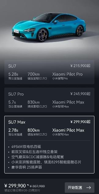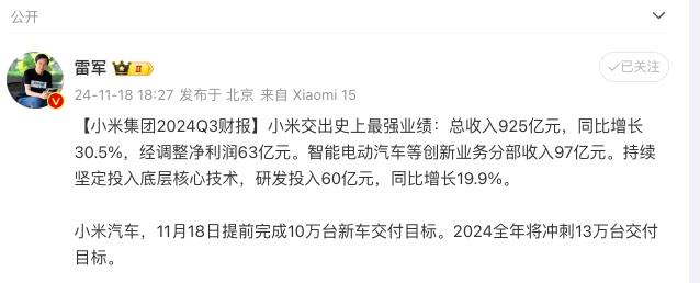 11月18日晚间,小米集团发布的2024年第三季度财报显示,公司第三季度总收入突破925亿元,较上年同期的708.9亿元增长30.5%;经调整净利润为63亿元,同比增长4.4%,其中包括智能电动汽车等创新业务经调整净亏损15亿元,环比收窄约16.6%。 对于智能电动汽车等创新业务亏损收窄的原因,小米集团副总裁兼首席财务官林世伟解释称,这主要得益于?于预期的汽??利率和??平的汽?交付。 图片来源:同辰微博(@雷军) 小米集团发布2024年第三季度财报的第一时间,小米集团董事长雷军在其个人微博上发文称:“小米交出了史上最强业绩。” 全年交付目标提升至13万辆 官方数据显示,小米SU7系列车型在2024年第三季度交付约3.98万辆,平均单价约23.87万元。 得益于小米SU7的市场表现,小米集团智能电动汽车等创新业务在2024年第三季度总收入高达97亿元。其中,智能电动汽车销售收入95亿元,其他相关业务收入2亿元。 日前,小米汽车官宣,小米汽车在小米SU7发布230天即完成了第10万辆车下线。“截至11月18日,小米汽车累计交付新车10万辆,提前完成全年交付10万辆的目标。”小米集团总裁卢伟冰在小米汽车2024年第三季度业绩电话会上表示,2024全年,小米汽车将冲刺13万辆新交付目标。 据卢伟冰透露,继10月单月交付量首次突破2万辆后,小米SU7在11月的交付量将再次突破2万辆。不仅如此,未来,小米汽车工厂产能还有一定的挖潜空间。基于当前工厂产能表现,小米集团将小米SU7全年交付目标从之前的12万辆调整为13万辆。 “冲刺这一目标,有一定难度,但我们对工厂现在产能有信心。”卢伟冰坦言,未来,公司希望每个月能保证在2万辆以上的产能和交付能力。 图片来源:小米汽车APP 11月19日,记者查阅小米汽车App发现,目前,小米汽车用户下订后,至少要等20周才能拿到车。其中,SU7标配版锁定订单后预计25~28周交付;Pro锁单后交付周期预计为22~25周;MAX高配版锁单后交付周期为20~23周。“由于整体新锁单量较大,相信未来交付周期会在20周左右。”卢伟冰称。 得益于高于预期的交付量、供应链给到的支持,小米集团智能电动汽车等创新业务分部毛利率达到了17.1%,环比增长1.7个百分点。“目前,小米的汽车业务还处在高投入阶段,相信工厂满产以及小米SU7 Ultra的开售,将会对毛利有非常好的改善。”林世伟表示。 现金储备不降反升 由于与智能电动汽车等创新业务相关的研发开支增加,小米集团研发开支由2023年第三季度的50亿元增加19.9%至2024年第三季度的60亿元。“小米坚持‘技术为本’铁律,持续加大研发投入,从底层技术做起,正在逐步提升核心竞争力。”11月19日,雷军发文称。 图片来源:同辰微博(@雷军) 官方数据显示,截至目前,小米汽车研发人员总数超2.04万人,全球专利数超4.1万件。 事实上,早在10月29日举办的小米新品发布会上,雷军就曾透露,2024年小米研发投入预计超240亿元,预计2025年将达300亿元。 11月14日,小米对外发布了智能底盘四项核心预研技术,全主动悬架、超级四电机系统、48V线控制动和48V线控转向,助力实现完全自动驾驶。端到端智全场景智能驾驶计划于2024年12月底开启先锋版推送。“小米造车坚持全栈自研,底盘是非常非常重要的技术,我们的自研不仅是智能座舱、自动驾驶、大压铸、‘三电’,还有底盘。”卢伟冰表示,小米在底盘技术方面投入非常大,已经做到了量产一代,发布一代。 值得注意的是,小米集团现金储备并没有因为高研发投入而降低。财报显示,截至2024年9月30日,小米集团现金储备为1516亿元,创历史新高。现金流方面,2024年第三季度,小米集团经调整经营性现?流为96亿元,其中新业务贡献正向现?流。 与此同时,小米集团还在持续拓展小米汽车的新零售网络。官方数据显示,截至2024年9月30日,小米汽车已在全国38个城市开业了127家汽车销售门店。“截至目前,小米汽车的销售门店已经超过了130家。”卢伟冰对外透露称。 按照规划,2024年年底,小米汽车销售服务网点将基本覆盖全国所有省份/自治区/直辖市,销售门店将覆盖46个城市共219家,服务中心则将布局86个城市共143家。 每日经济新闻 (责任编辑:董萍萍 )