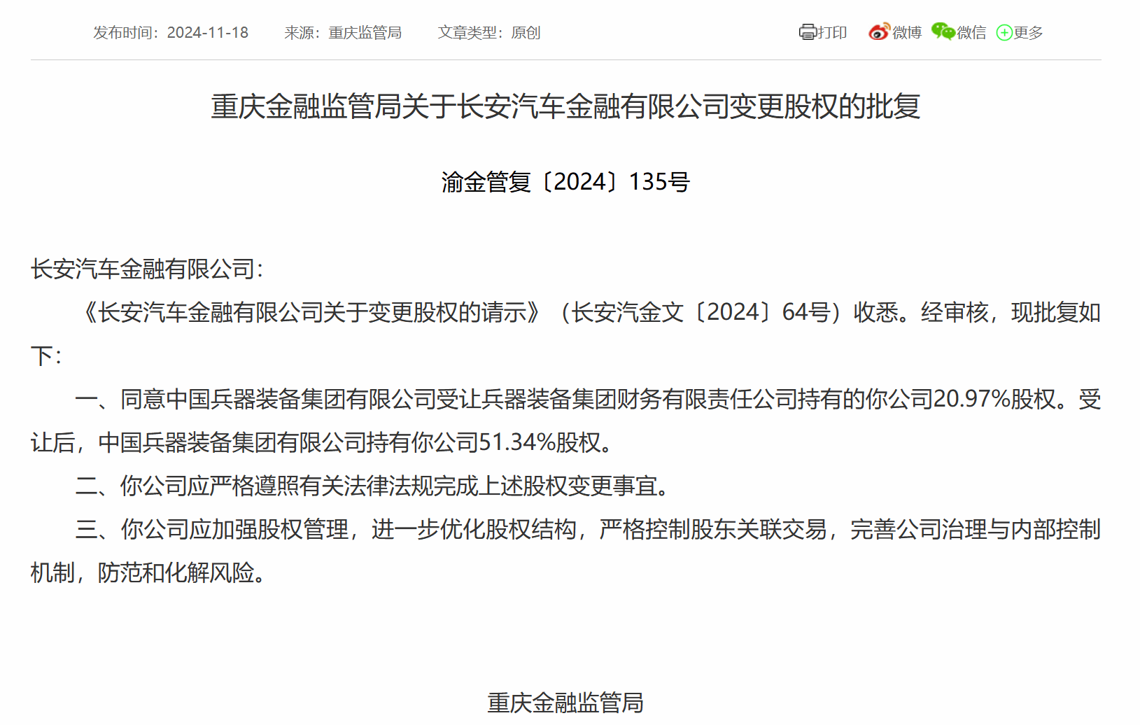 中国网财经11月19日讯昨日,重庆金融监管局公布相关批复信息,同意中国兵器装备集团有限公司受让兵器装备集团财务有限责任公司持有的长安汽车金融有限公司20.97%股权;受让后,中国兵器装备集团持有长安汽金51.34%股 ...
