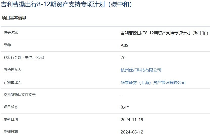 11月19日,据上交所网站,吉利曹操出行8-12期资产支持专项计划项目终止。项目原计划发行金额70亿元,受理日期为2024年6月12日,原始权益人为杭州优行科技有限公司,计划管理人为华泰证券资产管理有限公司。责编:李文 ...