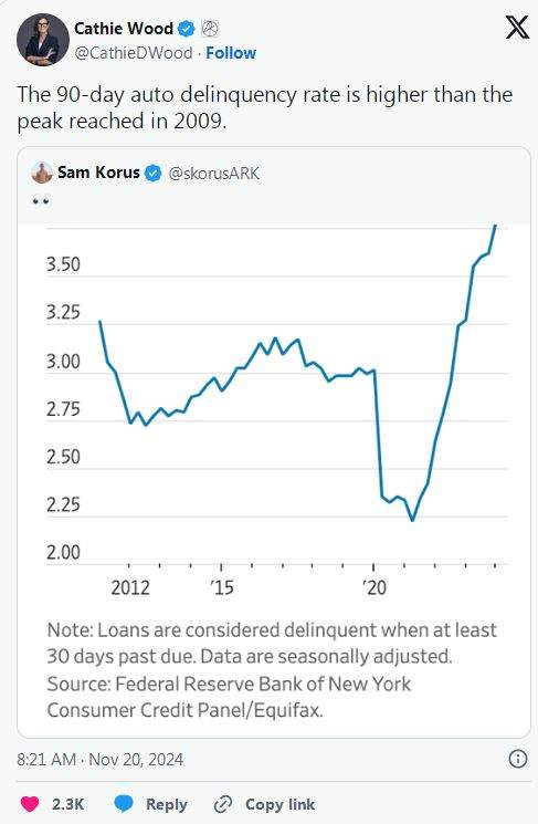 方舟投资管理公司CEO凯茜・伍德对美国的汽车贷款状况发出了警告,她指出,目前90天的拖欠率已经超过了2009年金融危机期间的水平。 伍德的评论是针对近期数据显示汽车贷款违约率上升而做出的,尽管投资者对汽车支持证券仍有信心。美联储最新的监管报告证实了这一趋势,强调汽车贷款拖欠率将在2024年接近五年来的最高水平。 汽车贷款拖欠率是指汽车贷款借款人未能按时按期偿还贷款的比例。当一笔贷款在一段时间内(通常是30天、60天或90天)没有还款时,通常被认为是拖欠贷款。 汽车贷款拖欠率上升的同时,整个汽车行业都在大幅降价。今年4月,由于第一季度交付量低于预期,特斯拉将Model Y、Model X和Model S在美国的售价下调了2000美元。 福特汽车将野马Mach-E的价格下调了至多8100美元,日产将其运动型多功能车Ariya的价格下调了至多6000美元。Stellantis也推出了吉普牧马人和大切诺基的折扣。 尽管有这些警告信号,投资者仍在积极追捧汽车贷款支持债券,截至2024年10月,与次级汽车贷款相关的证券销售额接近400亿美元,比2023年的总额增长了17%。Federated Hermes高级投资组合经理尼古拉斯・特里波德斯(Nicholas Tripodes)报告称,这些交易“被超额认购了近20倍”。 违约率上升与投资者热情之间的脱节反映了更广泛的市场动态。去年10月,全球贷款服务公司(Global Lending Services)投资级评级最低的汽车债券收益率约为6%,是2021年同类次级汽车贷款支持债券收益率的三倍。 这种压力在挣扎于生活成本上升和利率上升的低收入借款人中尤为明显。美联储的数据显示,6月份整体汽车贷款拖欠率达到3.8%,为2010年以来的最高水平。 美联储指出:“2024年上半年,消费者贷款的拖欠率仍居高不下,”并补充称,虽然第二季度信用卡拖欠情况有所改善,但汽车贷款违约率继续同比上升。 来源:同辰网 (责任编辑:宋政 HN002)