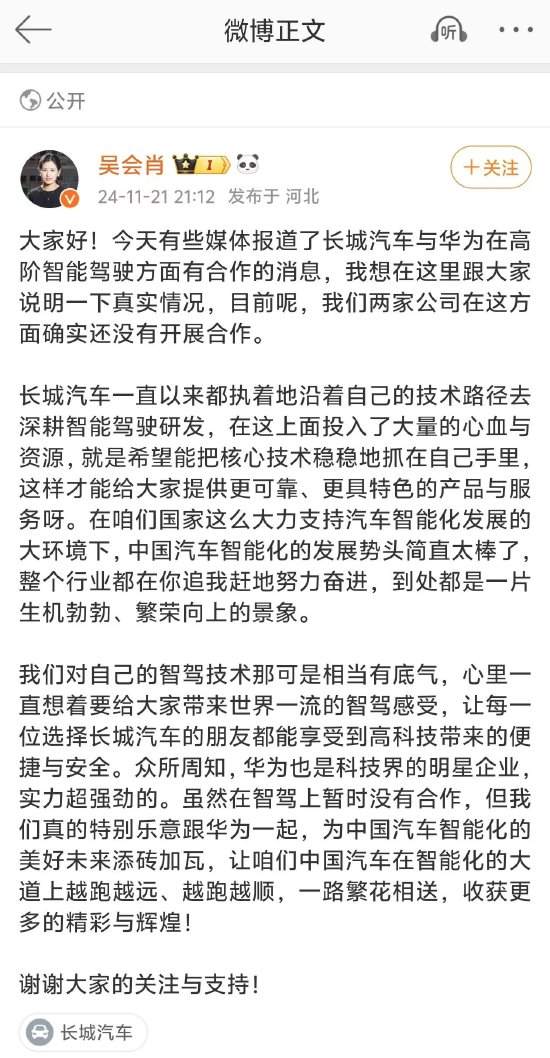 新浪科技讯11月21日晚间消息,今日有媒体报道称长城和华为正在紧密洽谈高阶智能驾驶的合作,长城旗下坦克品牌的一些关键产品将搭载华为的智能驾驶、智能座舱方案。针对此消息,长城汽车CTO吴会肖在其个人微博上表示 ...