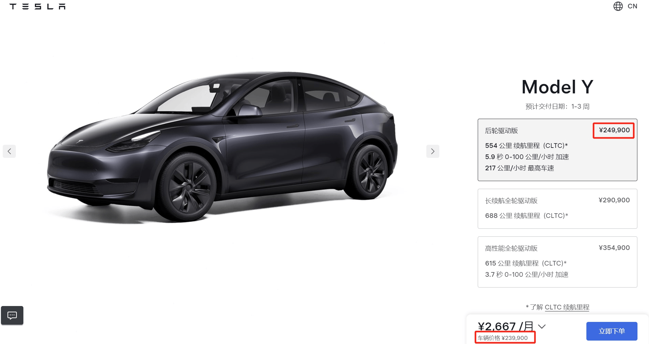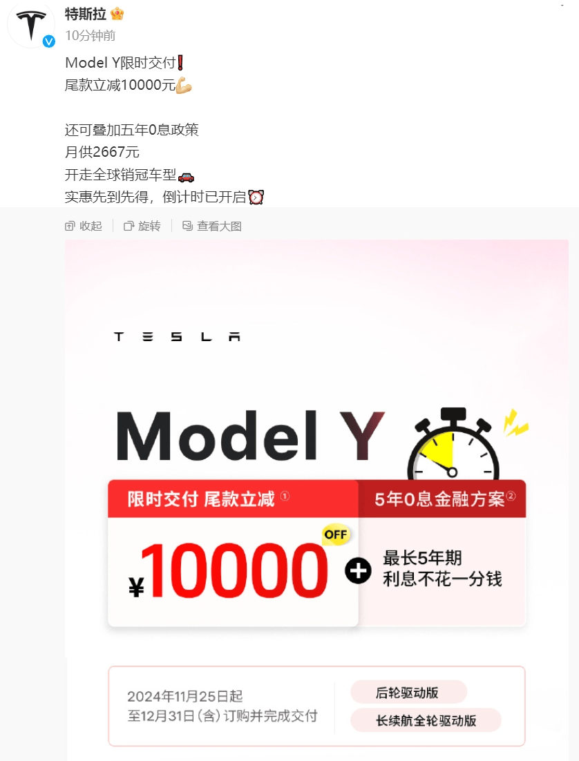 据特斯拉微博11月25日消息,Model Y限时交付尾款立减10000元,可叠加五年0息政策。 特斯拉表示,“限时交付 尾款立减”活动限2024年11月25日起至12月31日(含)下订活动Model Y车型并完成提车。 “限时金融特惠方案”限2024年12月31日(含)前,下订本金融特惠活动指定车型。有零息方案与低息方案可择一但不可同享。 以Model Y后轮驱动版为例,总车价减免10000元后为239,900元,并成功申请5年期限时0息贷款方案,若首付为79,900元,年作利率为0%,则月供约2,667元。数据仅供参考,首付金额与月供等随贷款金额等因素变动,最终以选择的特斯拉合作金融机构实际申核结果和合同为准。 特斯拉官网显示,本次尾款立减10000元的优惠政策今日已经可以享受,Model Y后驱轮动版下单价格已显示为239,900元。 据央视财经11月23日报道,凭借美国特斯拉公司股价近段时间的大幅上涨,世界首富、特斯拉创始人埃隆・马斯克的身家水涨船高,其个人净资产也创下历史新高。 截至22日收盘,特斯拉公司股价上涨3.8%,收于每股352.56美元,创2022年上半年以来收盘新高,公司总市值达到1.13万亿美元。 据美国有线电视新闻网22日报道,彭博亿万富翁指数公布的最新数据显示,特斯拉公司创始人兼首席执行官马斯克的个人净资产达到3478亿美元、约合人民币2.52万亿元,打破了他2021年11月曾创下的纪录。 报道称,自美国11月5日举行总统选举以来,特斯拉股价已上涨约40%,马斯克的个人财富同期增加大约830亿美元、约合人民币6014亿元。部分市场人士认为,这主要是因为市场押注特斯拉将受益于美国当选总统特朗普第二届任期的相关政策。 据券商中国此前援引彭博社消息,有知情人士透露,美国当选总统特朗普的团队计划将“构建完全自动驾驶汽车的联邦框架”作为美国交通部的优先事项之一。 报道称,马斯克把特斯拉的未来押注在自动驾驶技术和人工智能(AI)上,如果新的法规能让完全无人驾驶汽车成为可能,马斯克将直接受益。 2024年第三季度,特斯拉实现营收251.82亿美元,同比增长8%;净利润为21.67亿美元,同比增长17%;毛利率增至19.8%,同比增加约2个百分点;扣除其他业务和碳积分带来的利润,其汽车毛利率也高达17.1%。其净利润和毛利率水平均远超市场预期。 销量方面,2024年第三季度特斯拉的全球电动车交付量约46.3万辆,创下2024年季度交付新高。同期,特斯拉于10月22日迎来了全球第700万辆整车下线。 特斯拉CEO埃隆・马斯克同样释放了十分乐观的预期。他预计,除非发生重大负面事件,2025年汽车销量将增长20%至30%。 每日经济新闻综合自特斯拉官方微博、官网、央视财经、券商中国、特斯拉财报 免责声明:本文内容与数据仅供参考,不构成投资建议,使用前请核实。据此操作,风险自担。 (责任编辑:王治强 HF013)