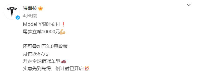 年初打响今年汽车行业价格战“第一枪”的特斯拉,在今年的最后两个月还在继续降价。 11月25日,特斯拉上线尾款立减活动,从11月25日到12月31日期间,特斯拉Model Y后轮驱动版及长续航全轮驱动版车型尾款立减10000元,售价23.99万元起,同时还能选择5年0息金融方案。 特斯拉方面表示,在特斯拉最新上线的“限时交付 尾款立减万元”政策加持下,叠加5年0息金融方案、国家及各地新能源“以旧换新”补贴,买电动车直接省下最少5万元。 特斯拉“销冠”降价,冲击年度销量 2024年初,特斯拉曾在财报中预测,2024年特斯拉车辆销量增速将放缓,显著低于2023年。今年前三季度,特斯拉在全球交付了129.3万辆电动车,如果想达成2023年181万辆的交付成绩,需要在第四季度完成超50万辆的交付。 本次特斯拉对Model Y车型降价,或正是出于在四季度冲刺销量的考量,因为Model Y车型是特斯拉的“销冠”。此前在2023年,特斯拉Model Y在中国市场的总销量达64.7万辆,夺得年度车型销量冠军。2024年10月,据第三方平台统计,在各线城市车型销量榜单中,特斯拉Model Y夺得一线、新一线城市车型销量冠军。 特斯拉方面表示,中国是特斯拉全球售价最低的市场之一,最多比其他地区便宜18.5万元。以Model Y为例,在英国起售价换算成人民币超过40万元,而在中国起售价仅23.99万元。 据记者不完全统计,今年以来特斯拉在中国市场已经进行至少6次降价或优惠活动。1月12日,特斯拉中国官网对Model 3/Y后轮驱动版及长续航版售价进行调整,下调幅度6500至15500元不等。2月1日,特斯拉提供限时优惠,对Model Y指定版本提供8000元现金减免。3月1日,特斯拉提供最高达3.46万元的限时购车福利。4月21日,特斯拉对中国市场在售的Model Y、Model S和Model X全系降价1.4万元。7月1日,特斯拉对Model 3和Model Y推出“5年0息”等多项购车优惠。 这背后,得益于特斯拉成本的下滑。在2024年第三季度财报中,特斯拉表示,单车销售成本已经降至历史最低水平,约为3.51万美元(约合人民币25.4万元)。特斯拉首席财务官Vaibhav Taneja表示,这要得益于原材料成本、运费、关税和其他一次性费用降低以及公司降本增效举措的推行。 截至11月22日收盘,特斯拉股价报352.56美元/股,上涨3.8%,创下2022年上半年以来收盘新高,公司总市值达到1.13万亿美元。尽管2024年特斯拉销量放缓,但2025年有望重回增长通道。据特斯拉CEO马斯克预计,除非发生重大负面事件,2025年特斯拉汽车销量将增长20%至30%。 汽车行业库存下降,价格战烈度趋缓 今年以来,汽车行业价格战成为常态,叠加以旧换新等政策驱动,乘用车市场迎来强力的去库存周期。据中国汽车流通协会乘用车市场信息联席分会(以下简称“乘联分会”)统计,截至2024年10月底,全国乘用车库存为297万台,较上月降低5万台,较2023年10月下降71万台,且较2022年10月减少75万台。 乘联分会秘书长崔东树在个人公众号发文表示,2024年10月底的库存与未来销量综合预估的现有库存支撑未来销售天数在40天,相对于2022年10月的64天和2023年10月的50天,均下降较大,乘用车行业总体库存压力不大。 今年以来,汽车价格战激烈程度超过往年。据崔东树统计,2024年前8个月,国内市场总体降价品牌车型数173个,超过2023年全年150款车型水平,也超过2022年以前降价品牌总和。 不过崔东树认为,随着秋季降价潮逐步平稳,乘用车市场将逐步重回促销增量的常态化竞争局面。随着国家报废更新的促销补贴的力度强化,市场回暖,对车市的拉动效果很明显,因此价格战的压力相对减缓,年末车市将进入持续走强的良好状态。 据东方金诚宏观研究数据,伴随支持“两新”政策持续发力,10月份中国汽车销量继续改善,汽车“价格战”进一步缓解,当月新能源小汽车价格同比下降6.6%,降幅较上月进一步收窄,燃油小汽车价格下降6.1%,降幅与上月持平。 信达证券研报表示,2023年汽车行业开启大规模价格战,2024年价格战仍在延续,但合资品牌在产品、渠道、营销等方面已加速式微,市场份额或进一步向龙头自主及新势力集中。展望2024―2026年,预计汽车行业淘汰赛将加速,车企将在规模、成本和技术间进行决战,合资品牌份额或将从目前的40%以下降低至20%以下,其释放出的20%份额对应将是自主品牌的成长空间。 本文首发于微信公众号:证券时报。文章内容属作者个人观点,不代表西瓜财经立场。投资者据此操作,风险请自担。 (责任编辑:宋政 HN002)