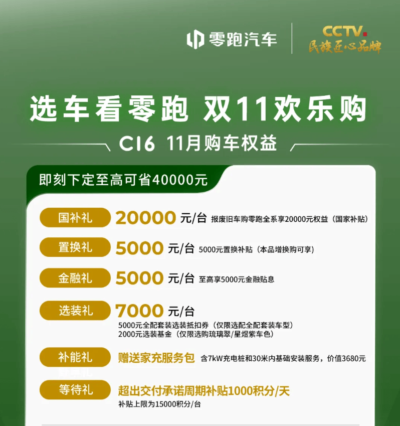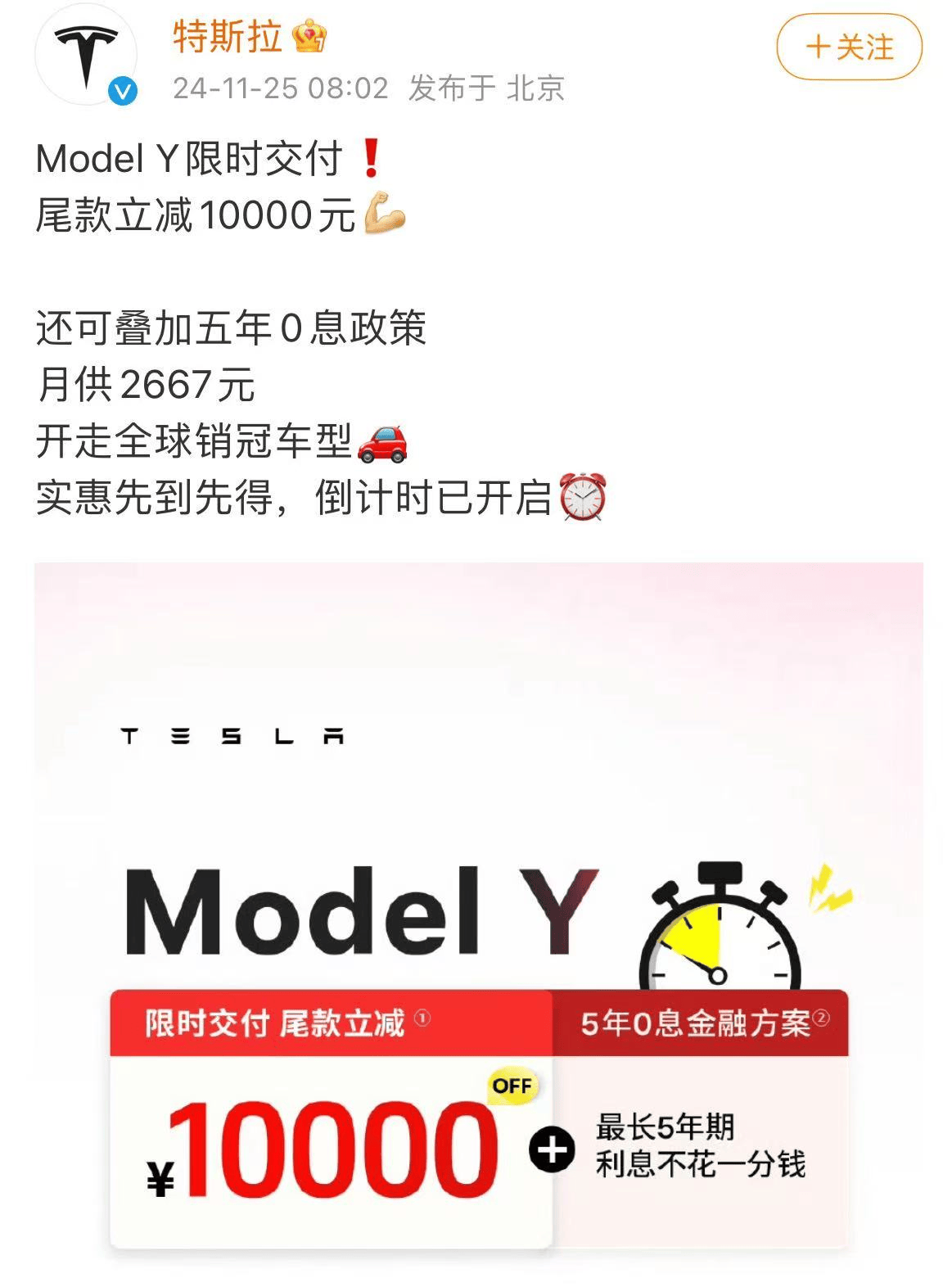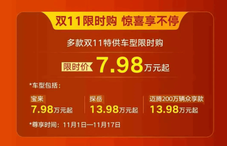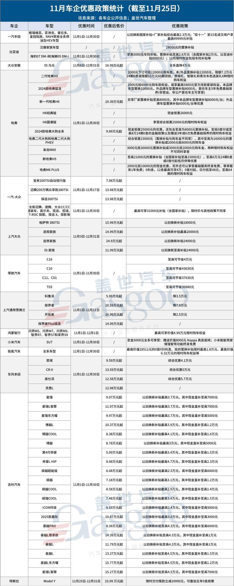 特斯拉Model Y限时交付尾款立减1万元 11月25日,特斯拉中国官微宣布,Model Y 限时交付尾款立减10000元,可叠加五年0息政策,用户需要在 2024年11月25日起至12月31日(含)订购并完成交付,该活动适用于后轮驱动版、长续航全轮驱动版车型。 图片来源:特斯拉 以Model Y后轮驱动版为例,总车价减免1万元后售价为23.99万元。若首付为7.99万元,年化利率为0%,则月供为2667元。另外,在此之前,特斯拉 Model 3 / Y 汽车 5 年 0 息购车活动已经延期至 11 月 30 日。 一汽丰田综合最高优惠2.3万元 11月11日,一汽丰田官方宣布,2024年11月1日至11月30日期间,用户购车享以旧换新国家补贴+厂家补贴综合最高2.3万元,“双十一”前15名成交用户享最高49999元补贴。 从官方公布的海报来看,参与此次活动的有格瑞维亚、亚洲龙、普拉多、皇冠陆放、RAV4荣放全系燃油及HEV车型。 图片来源:一汽丰田 此外,据官方信息显示,2018年前销售车辆入厂且评估送空调滤芯(限2.5万辆),车辆回厂享价值218元轮辋清洁+发动机深度检查套餐(限4万辆),更换刹车油前两瓶免费(限2万辆)等售后服务优惠政策。 比亚迪最高优惠2.8万元 11月10日,比亚迪(002594)针对汉唐家族车型推出了购车优惠活动。具体来看,在活动期间购买比亚迪汉或唐系列车型的朋友,均可享受高达28000元的置换补贴。此外,购买了比亚迪(包括但不限于汉、唐等),就有机会参与抽取这60辆新车使用权的大奖。 此外,在11月1日,比亚迪官方还表示,在2024年11月1日至11月30日期间购买比亚迪海豹07 DM-i、海狮05 DM-i并完成购车开票,可享至高5000元车险补贴、置换补贴至高2.6万元(含国家补贴2万元、比亚迪补贴6000元)等限时权益。 11月限时权益包括车险补贴(最高5000元)、0首付(最低0首付,至高5年超长贷)、0利息( 首付50%起,24期0息);置换补贴至高2.6万元(含国家补贴2万元、比亚迪补贴6000元);首任车主自购车之日起可享受2年内免费充电桩及安装服务(海豹07DM-i 1.5L 70KM精英型、海狮05DM-i75KM版本不享受)。 大众 ID.与众限时成交价直降4万元 11 月 8 日,大众安徽 ID.与众推出最新购车权益,全系直降4万元,限时成交价16.99万元起,有效期为2024年11月8日-2024年12月31日。 图片来源:大众安徽小程序 与此同时,用户还可享受 0 首付 0 利息金融方案、首年免费基础保养、免费维保取送车、以及整车质保、三电质保等用车权益。此外,官方对在 11 月 8 日之前购买 ID.与众的用户提供相应现金补偿价差。 哈弗最高优惠2.6万元 11月6日,哈弗官方推出限时优惠活动,11月1日至11月30日内下定二代哈弗H9、2024款哈弗猛龙、全新哈弗H6、哈弗H6经典版/国潮版、2024款哈弗大狗、哈弗二代大狗/PHEV、哈弗枭龙 MAX、哈弗 M6 PLUS等车型,可享受现金补贴、置换补贴、金融贴息等优惠。 其中,二代哈弗H9可享受2000元下订可抵12000元购车款,本/外品置换补贴12000元,限额7.2万元24期0息或限额15万元60期贷款,另可享质保礼、智联礼和青灰车色选装礼6种限时购车权益。 2024款哈弗猛龙可享免费升级价值400元水墨江南灰磨砂定制色,订金2000元抵6000元购车款权益,或享最高5800元官方改款套装权益,本品牌车型置换10000元,外品牌车型置换补贴8000元,首任车主5年免费基础保养(非营运、非公户首任车主可享受)。 新一代哈弗H6限时权益价格10.39万元起,另享厂家置换补贴至高8000元,其中本品牌车型置换补贴8000元/台;外品牌车型置换补贴6000元/台;3年或6次免费基础保养(含首保)和至高5万24期0息,首任车主(非营运)发动机变速器核心零部件终身质保,终身免费智控服务,终身免费OTA在线升级,娱乐流量3年免费(3GB/月)。 哈弗H6经典版,则可以享受现金钜惠26000元,无限时购车权益;哈弗H6国潮版,可以享受综合钜惠25000元的限时购车权益。其中包含15000元的现金钜惠、5000元的限时置换补贴、至高5万24期0息的金融政策。 一汽-大众最高可享3.1万元补贴 11月4日,一汽-大众宣布,在11月1日至17日,针对宝来、迈腾200万辆众享款、探岳三款车型推出限时价格。 具体来看,宝来200TSI自动悦行版限时价格7.98万元起;迈腾200万辆众享款280TSI车型限时价格13.98万元起;探岳300TSI限时价格13.98万元起。 图片来源:一汽-大众 此外,即日起至11月30日,一汽-大众针对旗下多款车型推出以旧换新补贴政策,最高可享31000元补贴(含国家补贴)。值得注意的是,限时价与其他政策不同享。 据悉,该活动的车型包括全新迈腾、速腾、大众CC/CC猎装车、高尔夫、揽巡、揽境、T-ROC 探歌、探岳 X、探影等。 上汽大众最高优惠2.4万元 11月3日,上海地区汽车置换政策再加码,为进一步响应国家号召,上汽大众旗下多款款车型组团推出限时福利价。 图片来源:上汽大众 据悉,本轮置换政策主要针对以旧换新用户,即日起至2024年12月31日,用户在上海地区通过旧车置换购买纯电动车或燃油车,符合特定条件的均可享受政府一次性补贴,不限沪牌。在叠加上汽大众终端到店优惠之后,上海地区以旧换新补贴可达至高24000元。 具体来看,帕萨特380TSI家族限时一口价15.99万元起;途观家族限时福利价14.99万元起;途昂家族限时福利价24.9万元起。 除了燃油车,上汽大众为电车用户也提供了专属宠粉福利。活动期间,ID.家族以旧换新至高补贴24000元,限时成交价低至11.99万元起。 零跑汽车最高优惠4万元 11月2日,零跑汽车官方发布了11月的政策权益汇总,涵盖了C16、C10、C11、C01和T03五款全系车型。 图片来源: