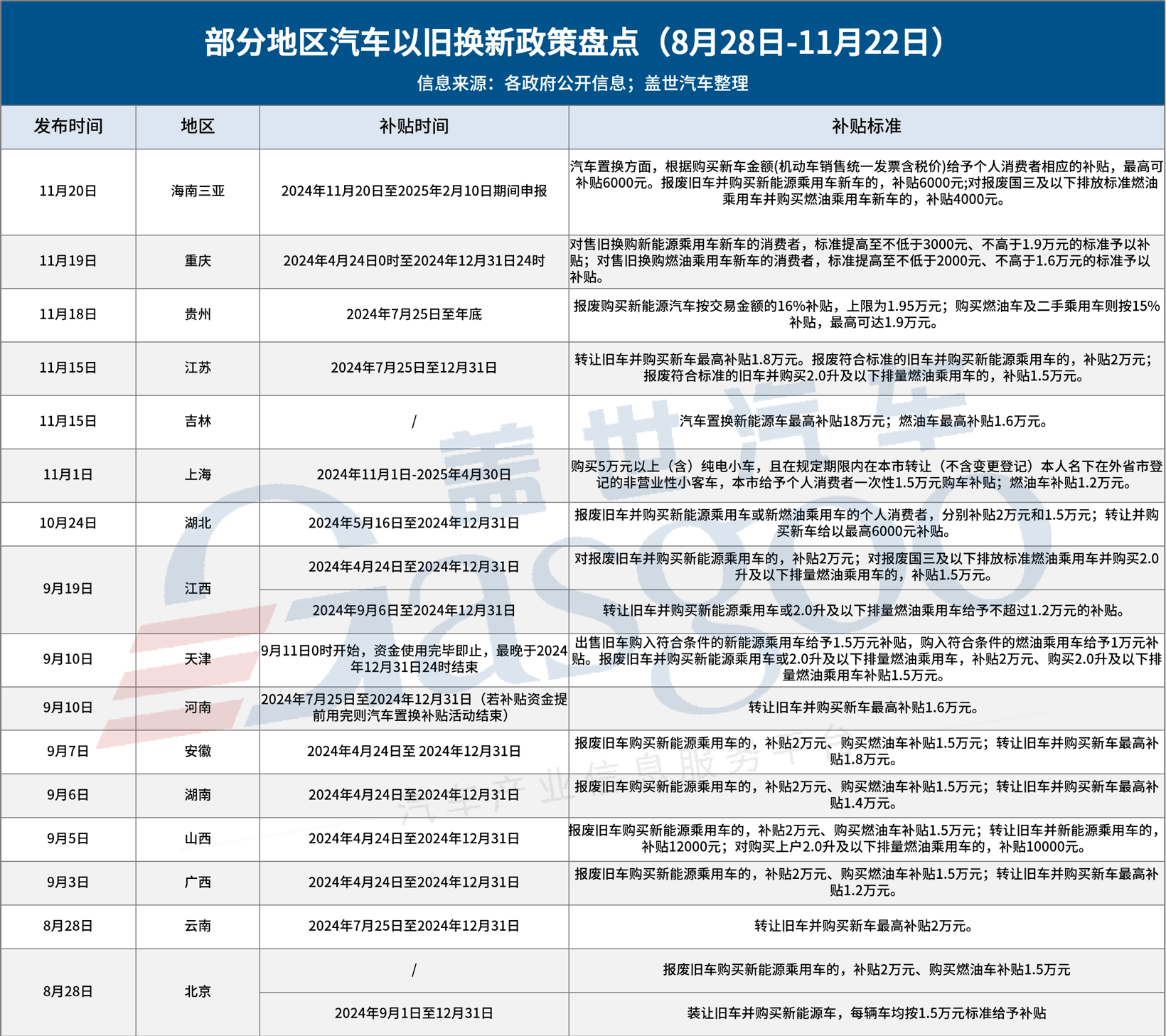 真金白银的补贴,使得国内车市欣欣向荣。据商务部最新数据显示,截至11月18日,全国汽车以旧换新补贴申请总量突破400万份,其中报废更新和置换更新补贴申请各突破200万份。 据悉,今年8月,商务部、财政部等7部门发布《关于进一步做好汽车以旧换新有关工作的通知》,提出对报废更新的个人消费者,购买新能源乘用车和购买燃油乘用车的补贴标准分别提高至2万元和1.5万元。与之前相比,这些补贴金额至少翻了一番。 在此背景下,全国各地纷纷响应号召,陆续出台了各自特色的汽车置换优惠政策。据盖世汽车不完全整理,截至目前,北京、上海、天津、重庆、湖北、湖南等省市均发布了相关的汽车置换补贴政策,且形式不一。此篇为近期汽车以旧换新政策梳理汇总,供业界参考。 海南三亚:最高可补6000元 11月20日,从三亚市商务局获悉,为进一步激发消费市场活力和增长潜力,推动消费提档升级,汽车报废更新补贴最高可补6000元。 据悉,2024年7月25日(含当日,下同)前注册登记在本人名下的国三及以下排放标准燃油乘用车或2018年4月30日前注册登记的新能源乘用车,并在三亚市注册登记的汽车经销企业购买新能源乘用车新车或燃油乘用车新车,给予个人消费者相应的补贴。 其中,对报废上述两类旧车并购买新能源乘用车新车的,补贴6000元;对报废国三及以下排放标准燃油乘用车并购买燃油乘用车新车的,补贴4000元。 在汽车置换更新补贴方面,自2024年7月15日至2024年12月31日期间,对个人消费者转让(不含变更登记和报废)2024年7月14日前注册登记在本人名下的燃油乘用车(包括2011年7月1日后注册登记的汽油乘用车、2013年7月1日后注册登记的柴油乘用车和其他燃料类型乘用车,以及两个日期前注册登记的国四排放标准的相应类型乘用车)或2018年5月1日后注册登记的新能源乘用车,并在三亚市注册登记的汽车经销企业购买乘用车新车,凭在三亚市开具的机动车销售统一发票,按照“每转让一辆旧车并购买一辆新车可享受一次补贴”原则,根据购买新车金额(机动车销售统一发票含税价)给予个人消费者相应的补贴,最高可补贴6000元。 重庆:最高补贴1.9万元 11月19日,重庆市商务委发布消息,为进一步提升消费品以旧换新政策效能,重庆市对汽车置换更新等内容进行了优化升级。 对售旧换购新能源乘用车新车的消费者,标准提高至按裸车价的7%四舍五入取整十且不低于3000元、不高于1.9万元的标准予以补贴。 对售旧换购燃油乘用车新车的消费者,标准提高至按裸车价的6%四舍五入取整十且不低于2000元、不高于1.6万元的标准予以补贴。 对已按原标准兑付的按新标准补齐差额,对审核通过还未兑付的以及新申报审核通过的按新标准予以补贴。 贵州:最高补贴1.95万元 11月18日,贵州省商务厅发布了《贵州省2024年汽车置换(报废)更新补贴实施细则》。 从2024年7月25日至年底,个人消费者在全国范围内通过正规汽车、二手车经销企业或报废机动车回收拆解企业,转出或报废在7月25日前登记在个人名下的旧乘用车,并购买符合条件的新能源乘用车、燃油乘用车或二手乘用车(新车销售发票需在贵州省内出具),均可享受补贴。 具体补贴标准为:购买新能源汽车按交易金额的16%补贴,上限为1.95万元;购买燃油车及二手乘用车则按15%补贴,最高可达1.9万元。 对于10月31日前活动期间内已产生的个人与个人之间的旧车转让置换,政策采取追溯补偿机制。但需注意,11月1日后个人之间的转让置换将不再享受此政策。 江苏:最高补贴1.8万元 11月15日,江苏省商务厅发布《江苏省汽车置换更新补贴申请问答(二)》,对补贴范围进行了调整。 变化一:江苏省江苏牌照旧车交易至外省申请补贴要求放宽,现调整为,7月25日至12月31日期间完成转让登记,并在江苏省内购买新车的,可以申请置换更新补贴。 补贴标准为,新车价格为5万元(含)至15万元的,燃油车每辆补贴6000元,新能源车每辆补贴9000元;15万元(含)至25万元的,燃油车每辆补贴10000元,新能源车每辆补贴13000元;25万元(含)以上的,燃油车每辆补贴15000元,新能源车每辆补贴18000元。 变化二:未达到国家报废更新政策相关要求的报废汽车可以参加置换更新活动。个人消费者按要求报废个人名下非营运乘用车,并在江苏省内购买新车的可以申请“省补”。 要注意的是,报废车辆注册登记时间需符合下列条件:2011年7月1日后注册登记的燃料种类为汽油的燃油乘用车;2013年7月1日后注册登记的柴油乘用车和其他燃料类型乘用车;2018年5月1日后注册登记的新能源乘用车。 对报废上述两类旧车并购买新能源乘用车的,补贴2万元;对报废国三及以下排放标准燃油乘用车并购买2.0升及以下排量燃油乘用车的,补贴1.5万元。 吉林:最高补贴1.1万元 11月15日消息,吉林省商务厅决定提高汽车置换更新补贴标准。 具体来看,新购车辆为传统燃油乘用车的,吉林省也将按照《机动车销售统一发票》金额分档予以补贴:价格5万元(不含)以下的,每辆补贴4000元;价格5万元(含)至10万元(不含)的,每辆补贴8000元;价格10万元(含)至15万元(不含)的,每辆补贴12000元;价格15万元(含)以上的,每辆补贴16000元。 值得一提的是,新车为新能源车型每档补贴再加3000元。 上海:最高补贴1.5万元 11月1日,上海市商务委等五部门印发《上海市进一步加力支持汽车以旧换新补贴政策实施细则》,自2024年11月1日起施行,有效期至2025年