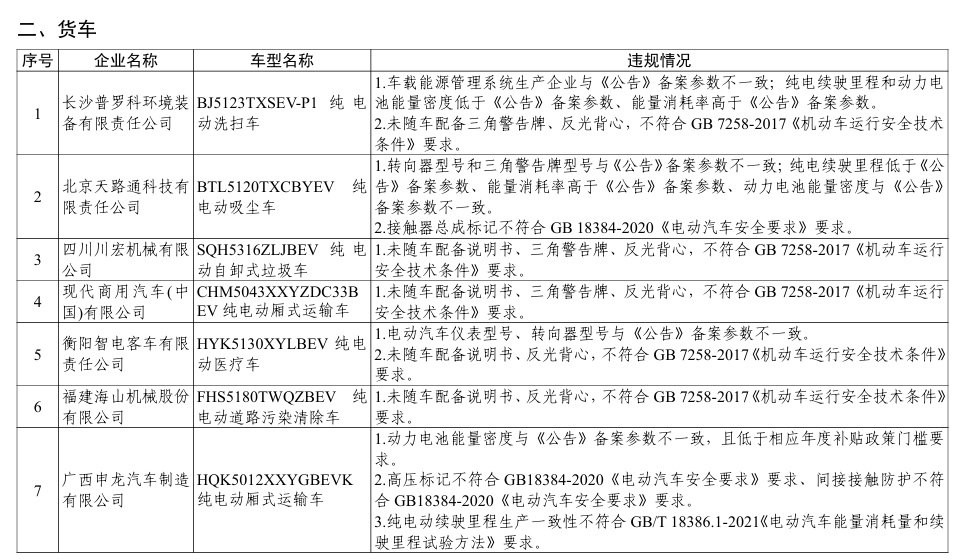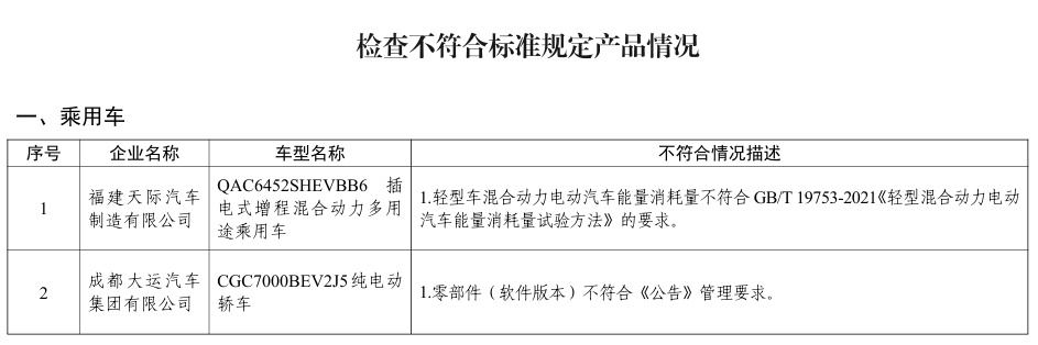 【大河财立方消息】11月25日,工信部发布关于2023年度新能源汽车监督检查结果的通报。 通报称,为规范汽车生产行为,加强事中事后监管,根据有关规定,工业和信息化部组织开展了2023年度新能源汽车产品生产一致性监督检查。检查发现共有9家企业的9个车型存在生产一致性问题。 工信部通过检查发现,新能源乘用车存在生产一致性的问题,共涉及福建天际汽车制造有限公司和成都大运汽车集团有限公司2家企业的2个车型产品,涉及电动汽车能量消耗量生产一致性不符合标准要求、零部件(软件版本)不符合《公告》管理要求。 在新能源货车存在生产一致性问题,共涉及7家企业的7个车型产品,涉及零部件参数与《公告》备案参数不一致、高压标记不符合标准要求等问题。 工业和信息化部表示,将按照有关管理的规定,依法依规处理。企业所在地省级工业和信息化主管部门要督促企业查明产品问题原因,制定整改措施并按照有关要求整改到位。 责编:陶纪燕 | 审核:李震 | 监审:万军伟 (责任编辑:董萍萍 )