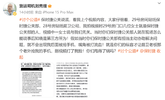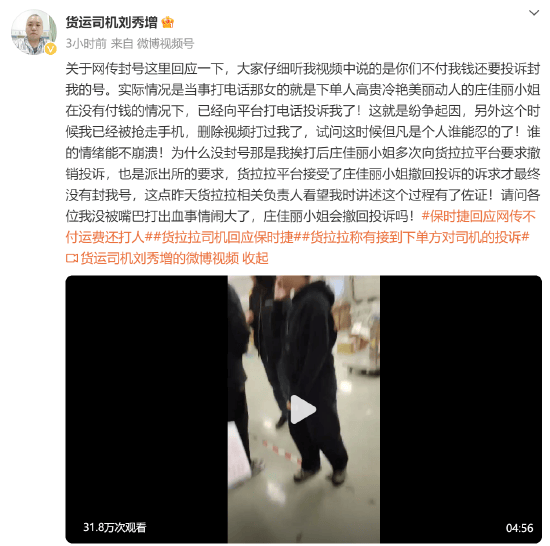 同辰科技讯 11月26日上午消息,近日,“货拉拉司机向保时捷维权” 的视频引发广泛关注。对此,货拉拉发布声明称,平台从未因此事件对账号封号,未扣除行为分,司机账号一直处于正常状态,可以正常抢单、接单。 最新消息显示,当事货运司机刘秀增转发货拉拉官方声明,并表示:我是当事人,从没有在网络任何平台发布过被货拉拉平台封号的言论,一直有澄清。不好抢中单也是事实!这是大数据时代一旦被记录违规,系统会自动降权。无法人为干预吧。情况说明基本属实。 他还在个人微博上发布了验伤通知书,并表示:保时捷公关说谎,看我上个视频内容,大家仔细看,29号房间贴纸保时捷公关部,28号房贴纸前卫公司,我拍视频时29号房门口几位女士就是保时捷公关部的人,视频中一女士说与我们无关。当时你们保时捷公关部人就在现场怎么能说事后知晓是第三方所为!假如当时你们保时捷公关部有担当主动协助解决问题,就不会出现我后面被抢手机,嘴角被打流血!就是你们的纵容才让前卫老板那个老外抢我的手机,删视频打了我脸!你们甩得了锅吗? 刘秀增在个人微博还陆续发布了此次事件的订单截图,其中包含了额外搬运费600元的相关信息,他表示:有人带节奏说我私下收钱,你真低估一个七年货拉拉司机的职业操守!睁开眼睛看看,另外附上与发货人尊贵的杨先生的通话记录,看时间段,等下单人付钱的同时及时联系了尊贵的杨先生确认了600块搬运费的事实,货拉拉平台有录音! 在最新一条发布内容中,刘秀增指出“关于网传封号这里回应一下,大家仔细听我视频中说的是你们不付我钱还要投诉封我的号。实际情况是当事打电话那女的就是下单人高贵冷艳美丽动人的庄佳丽小姐在没有付钱的情况下,已经向平台打电话投诉我了!这就是纷争起因,另外这个时候我已经被抢走手机,删除视频打过我了,试问这时候但凡是个人谁能忍的了!谁的情绪能不崩溃!为什么没封号那是我挨打后庄佳丽小姐多次向货拉拉平台要求撤销投诉,也是派出所的要求,货拉拉平台接受了庄佳丽小姐撤回投诉的诉求才最终没有封我号,这点昨天货拉拉相关负责人看望我时讲述这个过程有了佐证!请问各位我没被嘴巴打出血事情闹大了,庄佳丽小姐会撤回投诉吗!”(罗宁) (责任编辑:宋政 HN002)