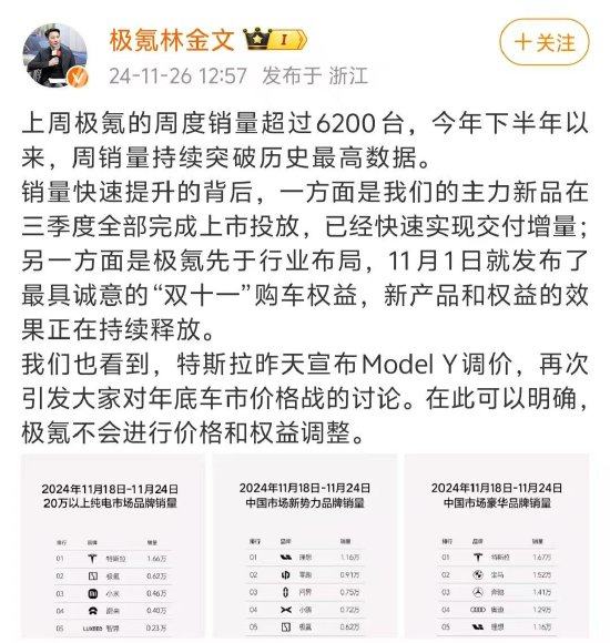 新浪科技讯11月26日下午消息,极氪智能科技副总裁林金文在其个人微博回应特斯拉降价。他表示,“极氪不会进行价格和权益调整。”他谈到,“上周极氪的周度销量超过6200台,今年下半年以来,周销量持续突破历史最高数 ...