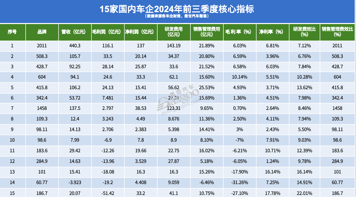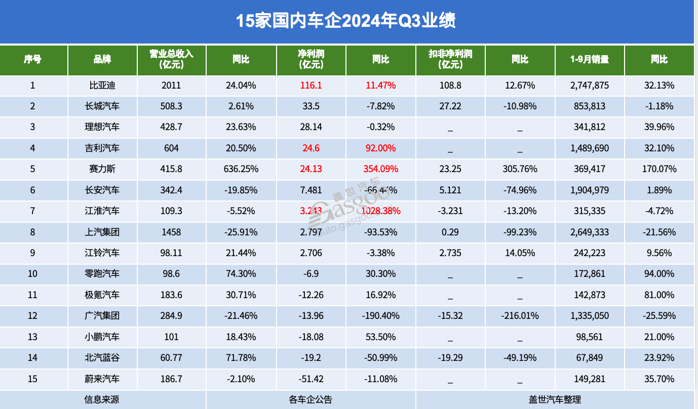 2024年第三季度,国内车企盈利格局分化加剧。 比亚迪一家独大格局继续稳固,独揽百亿盈利。其余8家实现正盈利的车企,合计净利润才和比亚迪(002594)不相上下,这凸显了行业内部盈利的巨大落差。另一个明显的特征是,民营车企展现出强劲的上升势头,占据了盈利前5席位。与之相对的是,曾经的行业翘楚――头部国有车企陷入经营困境。 在极致内卷的中国汽车市场之下,会赚钱、能赚钱的车企似乎正在减少。 图片来源:蔚来汽车 车企盈利版图重塑 2024年第三季度,中国汽车市场的盈利格局持续分化,呈现出鲜明的“冰火两重天”。 作为行业新领军者,比亚迪以2011亿元的营收和116.1亿元的净利润,继续成为季度内唯一一家营收破2000亿、净利破百亿的上市车企。然而,伴随着产品价格持续下探以及基数规模效应影响,其营收和净利润增速已明显趋缓。 紧随其后的第二梯队表现亦可圈可点。长城汽车(601633)凭借产品结构优化带动单车收入提升,连续三个季度净利润突破30亿元。 相较而言,理想汽车却呈现“增收不增利”的局面。第三季度销量同比增长45.4%至15.28万辆,但盈利能力却有所下滑,净利润为28.1亿元,同比微降0.3%。这主要是受制于产品结构性变化,主力车型由L7、L9变为L6(占比50%左右),使得单车均价同比减少近5万元至27万元。 吉利汽车受益旗下吉利银河、极氪两大新能源品牌的崛起,季度净利润同比大增92%至24.6亿元。紧随其后的赛力斯依托问界系列的热销,实现净利润同比增长3.5倍至24亿元。 与之形成鲜明对比的是,传统头部国有车企正经历前所未有的经营和转型阵痛。 上汽集团第三季度净利润仅为2.8亿元,同比大跌93.6%,低于市场预期。销量下滑以及价格战是导致盈利下降的主要原因。谁能想到,在两年前,上汽集团(600104)还连续多年蝉联国内最赚钱的上市车企。 三大央企之一的长安汽车(000625),也未能幸免。受报告期内销量下滑及新品推广费用攀升等因素影响,第三季度营收同比减少19.9%至342.4亿元,净利润同比下滑66.4%至7.5亿元。 广汽集团的处境更显艰难,在销量下滑和价格战的双重夹击下,继去年四季度后再度陷入亏损,净亏损达14亿元,同比暴跌1.9倍。 值得关注的是,“商乘并举”的江淮汽车(600418)借助资产处置收益和政府补助,实现净利润同比10倍增长至3.2亿元。今年前三季度,江淮汽车非流动性资产处置损益为5.8亿元,此外政府还补助了2亿元。江铃汽车(000550)营收表现稳定,报告期内净利润为2.7亿元,同比微降3%。 新势力阵营中,除理想汽车已实现稳定盈利外,其他玩家仍处于持续投入中,还在探索盈利的路上。 其中,蔚来汽车三季度净亏损达到51.4亿元,短期内转正无望。蔚来称,研发投入过高、乐道品牌渠道建设以及换电县县通技术的投入等,使得报告期内经营进一步承压。 不过,小鹏汽车、零跑汽车和极氪三家新势力已现亏损收窄迹象。其中,小鹏汽车第三季度净亏损18.1亿元,同比增长53.5%。零跑受益销量大幅上涨,降低了生产成本,同期净亏损收窄至7亿元。极氪品牌也因在高端市场销量有所突破,净利润实现16.9%的同比增长,亏损收缩至12.3亿元。 整体来看,国内车企盈利能力进一步重构。这凸显了新能源转型大潮下车企的适应能力差异。 差距怎么产生的? 近两年,中国车市正在经历一场史无前例的价格战洗礼。盖世汽车研究院指出,车市竞争激烈,竞争格局加速重塑,产业内卷将是持久战。价格战,成为考验车企承压能力的试金石,以及车企盈利出现分化的首要原因。 作为这轮价格战的引领者,比亚迪凭借强大的品牌号召力以及产业链优势成为最大赢家。其月销量已突破50万辆,这一数字甚至超过部分车企一年的销售规模。得益于规模效应带来的成本优势,比亚迪在价格战中依然保持21.9%的可观毛利率,有效抵消了单车净利降低(0.9 万元,同比减少17%)带来的影响。 在智能化领域,比亚迪正在迎头赶上。比亚迪“天神之眼”智能驾驶系统已实现批量装车,同时高端品牌方程豹与华为展开深度合作,搭载华为乾高阶智驾ADS 3.0系统。这为车企销量的持续增长注入新动能。 图片来源:长城汽车 长城汽车则凭借坦克在硬派越野SUV市场占有一席之地。其前三季度净利润实现翻倍增长,超百亿元。对此,国信证券(002736)分析认为,得益于出口业务的增长及产品结构的持续优化,公司业绩稳定释放。 第三季度,长城汽车出口量达12.3万辆,占总销量超四成。同时,坦克和WEY等高端品牌贡献6.6万辆销量,占比22.5%,推动单车净利同比增长8%至1.1万元。高端品牌坦克已然成为企业利润的新增长极。 吉利汽车和赛力斯的业绩双飞,都在于旗下新能源产品表现出了强劲的竞争力,短期内实现了销量规模的迅速扩大,改善了盈利能力。特别是赛力斯,凭借问界M7和M9在20万+市场的亮眼表现,今年跻身盈利梯队。盖世汽车研究院预测,问界系列今年销量有望突破43万辆。 然而,部分国有车企是这场转型竞赛中的困境者,比如上汽集团、广汽集团(601238)。一方面,集团业绩支柱――合资品牌为守住市场份额,加大了促销力度,导致收益大幅下滑;另一方面,部分国企自主板块的电动汽车主要集中在中低端市场,销量规模大但是利润空间薄弱。以上汽通用五菱为例,其新能源业务要实现盈利,需要达到年销百万辆的门槛。 在高毛利的细分市场如越野SUV、插混MPV等领域,这些企业又尚未形成有力的产品