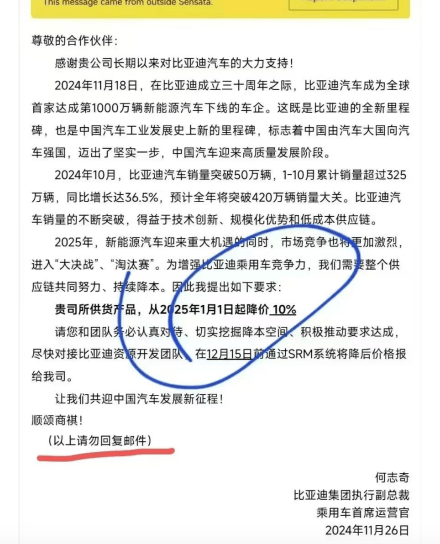 近日,一封主题为《2025年比亚迪(002594)乘用车降本要求》的邮件在网络上流传。 邮件内容显示,在比亚迪汽车成为全球首家达成第1000万辆新能源汽车下线的车企之际,比亚迪要求相关供应商所供货产品从2025年1月1日起降价10%。 比亚迪方面预测,2025年,新能源汽车迎来重大机遇的同时,市场竞争也将更加激烈,进入“大决战”“淘汰赛”。 为增强比亚迪乘用车竞争力,需要整个供应链共同努力、持续降本。为此,比亚迪要求相关供应商切实挖掘降本空间、积极推动要求达成,在12月15日前通过SRM系统将降后价格报给比亚迪。 对于上述邮件内容的真实性,证券时报・e公司记者第一时间向比亚迪方面进行求证。比亚迪内部人士表示,对于邮件中的内容,暂时无法核实真实性。 公开数据显示,2024年10月,比亚迪新能源汽车月销量首次突破50万辆,达到50.27万辆,同比增长66.2%,刷新了全球新能源汽车的月销量纪录。 前不久,比亚迪刚刚举办了公司创立30年活动,并迎来第 1000 万辆新能源整车的下线,成为全球新能源行业首个突破“千万里程碑”的车企。 在活动现场,比亚迪股份有限公司董事长兼总裁王传福首次讲述了比亚迪30年创业经历,并表示将坚持用技术创新满足人们对美好生活的向往,用实际行动回馈社会各界、车主和员工的支持。 据悉,在智能化的下半场,比亚迪将投入1000亿元,用于发展人工智能和汽车相结合的智能化技术,实现整车全面智能化进阶,赢得未来的技术话语权。 东兴证券研报显示,电动化为智能化提供了能量基础,随着产业链成熟,电动汽车同质化水平提升,行业竞争加剧,提供智能化功能将成为车企不掉队的必然选择。 本文首发于微信公众号:e公司。文章内容属作者个人观点,不代表西瓜财经立场。投资者据此操作,风险请自担。 (责任编辑:宋政 HN002)