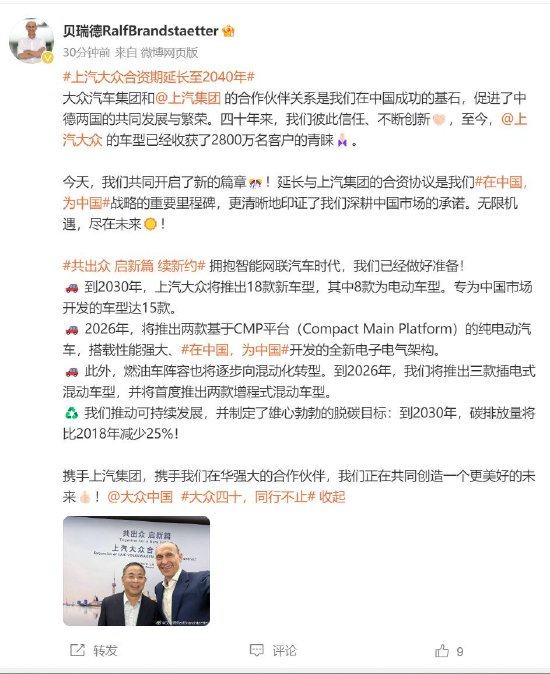 同辰科技讯 11月26日下午消息,大众汽车集团(中国)董事长兼首席执行官贝瑞德今日在微博上表示,大众汽车集团与上汽集团签署延长合资协议,将上汽大众的合资期延长至2040年。 他表示,大众汽车集团和上汽集团的合作伙伴关系是我们在中国成功的基石,促进了中德两国的共同发展与繁荣。四十年来,我们彼此信任、不断创新,至今,上汽大众的车型已经收获了2800万名客户的青睐。今天,我们共同开启了新的篇章,延长与上汽集团的合资协议是我们在中国,为中国战略的重要里程碑,更清晰地印证了我们深耕中国市场的承诺。无限机遇,尽在未来。拥抱智能网联汽车时代,我们已经做好准备。 据悉,到2030年,上汽大众将推出18款新车型,其中8款为电动车型。专为中国市场开发的车型达15款; 2026年,将推出两款基于CMP平台(Compact Main Platform)的纯电动汽车,搭载性能强大、为中国开发的全新电子电气架构。 此外,燃油车阵容也将逐步向混动化转型。到2026年,将推出三款插电式混动车型,并将首度推出两款增程式混动车型。在推动可持续发展方面,双方制定了脱碳目标:到2030年,碳排放量将比2018年减少25%。 (责任编辑:宋政 HN002)