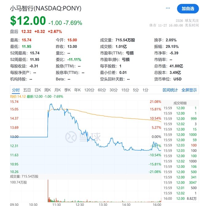 11月27日晚间,小马智行正式在纳斯达克挂牌上市,股票代码“PONY”,截至当日收盘,小马智行收于12美元/股,较13美元/股的发行价下跌7.69%。截至目前,广州已诞生两支“全球Robotaxi大股”。此前文远知行于10月25日在纳斯 ...