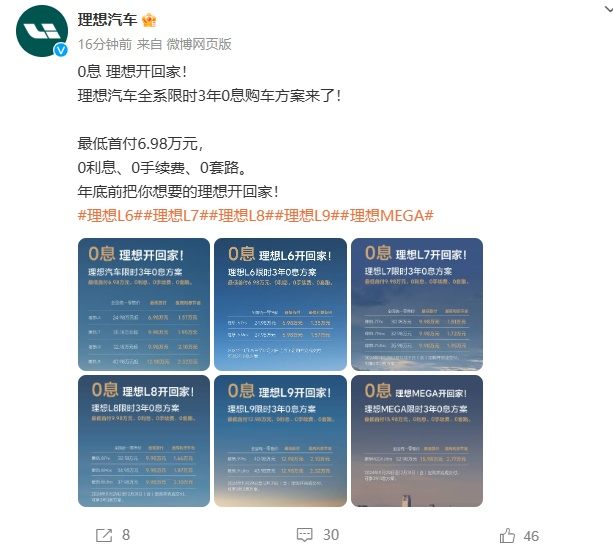 【大河财立方消息】11月29日,理想汽车发布全系限时3年0息购车政策。 理想汽车宣布,即日起至12月31日24时前,购买理想L系列和理想MEGA的用户,可享受最低首付金额3年0息金融方案。单车型最低首付金额分别为,理想MEGA首付15.98万元、理想L9首付12.98万元,理想L8、理想L7首付9.98万元,理想L6首付6.98万元。 责编:李文玉 | 审核:李震 | 监审:万军伟 (责任编辑:董萍萍 )