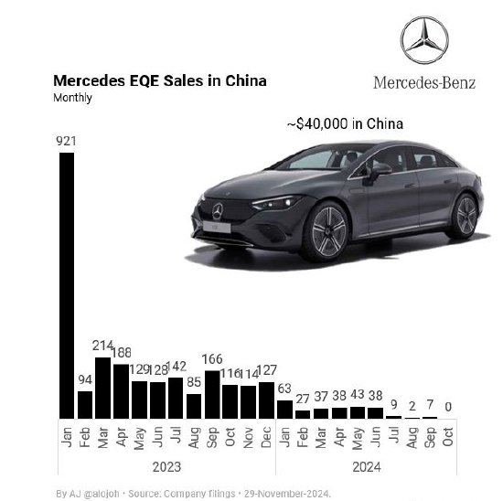 同辰科技讯 12月2日晚间消息,网络上流传的消息称,今年10月,奔驰EQE在中国市场的月销量为0,引发关注。 对于传闻的销量数据,奔驰官方客服表示,销量相关事宜建议咨询经销商。同辰科技联系了一家奔驰的北京经销商,销售人员表示,目前2022款EQE已经停售,而刚发布的2025款现车还没有到货,具体到货时间还是未知,销量不佳可能与此有关。 资料显示,奔驰EQE定位为中大型纯电轿车,于2022年正式上市,价格区间为52.8万-58.5万元。随后不久将建议零售价调整为47.8万元-53.43万元。 懂车帝数据显示,今年以来奔驰EQE在中国市场的月销量持续走低,从今年7月开始进入个位数,今年10月销量则暂时未查询到。 今年11月的2024广州车展期间,奔驰新款EQE 500 4MATIC纯电轿车正式上市。新车推出3款车型,售价区间为47.8万-62.7万元,不少网友吐槽新车定价过高。 责任编辑:王若云 (责任编辑:郭健东 )