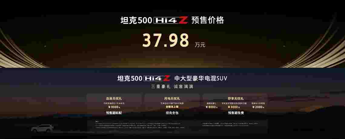 12月3日,坦克500Hi4-Z正式开启预售,预售价37.98万元,仅有一个配置车型。预售期间,新车送出三种权益,包括前桥差速锁及户外休闲包的9000元选装礼包