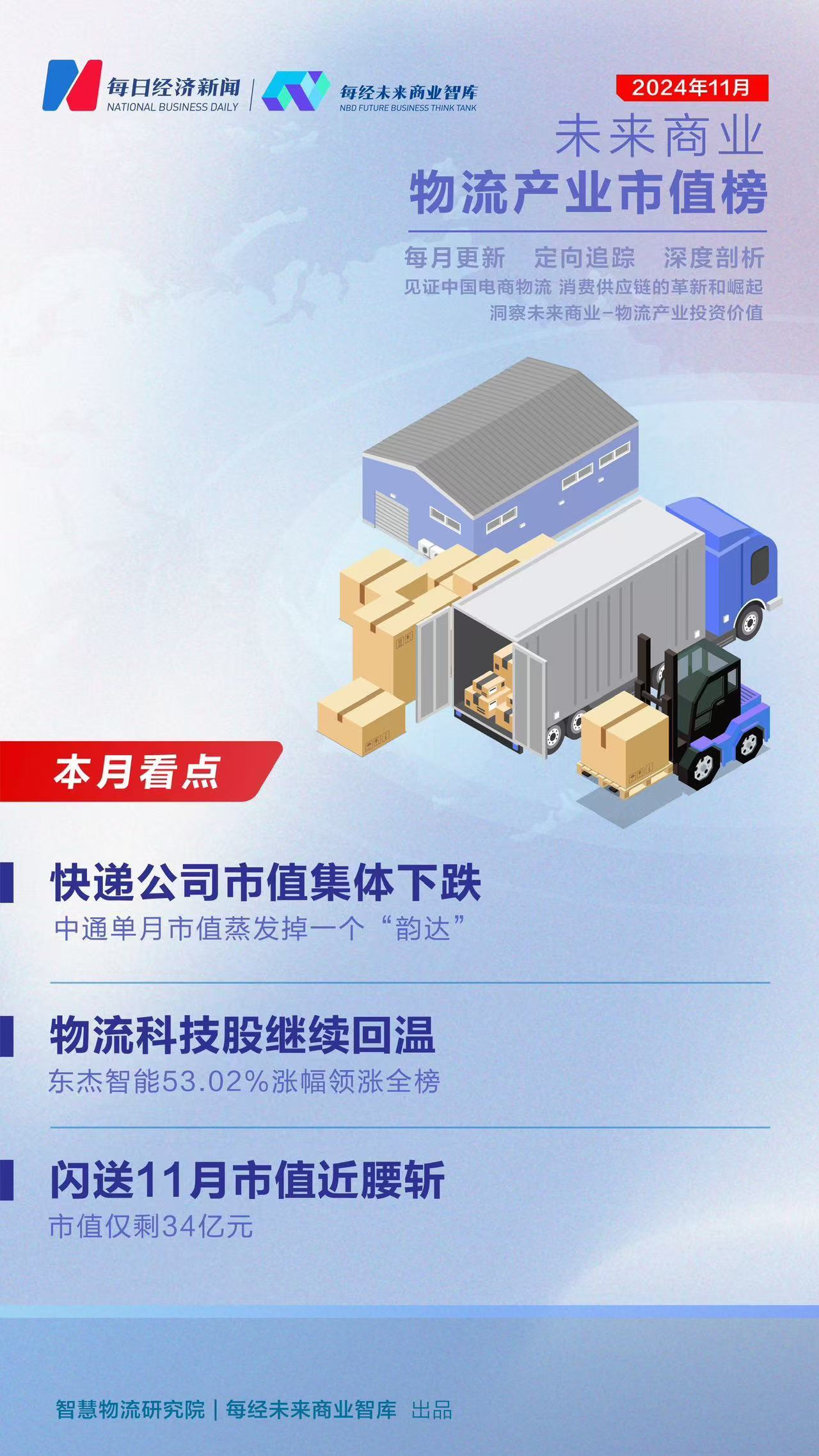 总市值环比再降6.14% 物流三头部市值下跌截至11月底,包含31家物流公司的物流产业上市公司总市值环比下降6.14%,金额减少464.38亿元至7094.18亿元。 三家头部物流公司市值均下跌,11月,顺丰控股(SZ002352)市值下跌5.64%,市值为2055.31亿元。业绩方面,顺丰前三季度营收达到2068.61亿元,较去年同期增长了9.44%;归母净利润为76.17亿元,增长幅度达到21.59%。 值得一提的是,11月27日,顺丰控股(HK06936)在香港联交所正式上市,上市首日市值超2000亿港元,成为快递物流行业首家“A+H”上市企业。随着顺丰在港股上市,加之此前旗下的嘉里物流(HK00636)、顺丰同城(HK09699)、顺丰房托(HK2191),顺丰创始人王卫已经拥有5家上市公司。 中通11月市值也下跌17.92%,月底市值为1075.73亿元。已连续两个月市值上涨的京东物流(HK02618),11月市值回落12.03%,11月底市值为829.09亿元。业绩方面,前三季度,中通实现营收313.61亿元,同比增长12.81%;京东物流营收则为1307.41亿元,同比增长9.37%。 市值总榜排名第四的满帮(YMM),11月市值则上涨11.84%至743.23亿元。11月,顺丰、中通、京东物流三头部市值占比为55.82%,较10月下降了2.45个百分点。 东杰智能53.02%涨幅领涨全榜 9家物流科技公司集体上涨11月,31家物流公司中15家物流公司市值上涨,8家涨超10%。其中,东杰智能(SZ300486)以53.02%涨幅领涨全榜,诺力股份(SH603611)17.48%涨幅紧随其后。 我们注意到,东杰智能11月市值大涨或与签下两笔重要订单合同有关。消息面上,11月22日,东杰智能发布公告称,公司与万邑通签订了全球采购框架协议,合同总金额约6.98亿元,占公司2023年度经审计主营业务收入的80.07%。紧接着,11月29日,东杰智能再次公告称,公司与马来西亚PTT LOGISTICS SDN BHD签订设备集成采购合同,总金额约为5.8亿元,占公司2023年度经审计主营业务收入的66.94%。 值得一提的是,继10月市值集体上涨后,11月,9家物流科技公司再次上榜涨幅榜,科捷智能(SH688455)、德马科技(SH688360)11月市值也分别上涨15.05%、13.05%。 由于市值变动,今天国际(SZ300532)以56.81亿元市值成为11月物流科技产业市值榜榜首。优博讯(SZ300531)11月市值下跌4.14%,市值排名掉落至子榜第三。截至11月底,11家物流科技公司构成的物流科技总市值为409.09亿元,较10月增加37.44亿元。 闪送11月市值近腰斩 “双11”“通达兔”市值再度集体下跌11月,31家物流公司中有16家市值下跌,5家跌超10%。其中,10月登榜的闪送11月市值接近腰斩,跌幅为47.84%。上市首日,闪送市值达到90.81亿元,但连续两个月市值大跌后,11月市值仅剩34亿元。 业绩方面,闪送最新财报显示,前三季度其营收34.39亿元,同比增长3.7%。虽然相比之下,闪送在“一对一专送”市场有一定的差异化模式的优势,但整体来看,即时配送市场巨头林立,竞争依然激烈。 不过,另两家即时配送公司11月市值也下跌,其中,达达(DADA)跌去12.57%,11月底市值降至26.91亿元,顺丰同城(HK09699)也下跌3.99%,11月底市值为79.15亿元。 快递公司方面,受益于今年电商“双11”的提前,多家快递上市公司10月快递业务收入实现同比较大幅度增长。业务收入与业务量增幅比较明显的,如圆通速递(SH600233)10月实现快递业务收入57.04亿元,同比增长26.94%;业务完成量为24.73亿票,同比增长31.18%。 不过,快递公司市值表现“旺季不旺”似乎成了常态。11月,快递公司市值再次集体下跌。其中,中通跌幅最大,11月市值跌去一个韵达的市值体量。11月韵达市值下跌4.92%,市值为229.62亿元。圆通速递、申通快递(SZ002468)11月市值也分别下跌11.89%、9.68%。极兔速递(HK01519)11月市值下跌5.04%,市值降至466.86元。 今年快递公司间的竞争愈演愈烈,特别是申通与韵达。上半年,韵达攻势凶猛,单月业务量增速连续三个月超过申通,不过自6月以来,申通业务量增速又连续反超韵达,而在9月和10月,韵达再次领先,两家的单票收入差距也连续三个月保持在0.01元。年关将至,各家成绩单即将出炉,快递公司新一轮“抢二”“争三”的结果或也即将揭晓。 *编者注: 我们深知,无论一个行业、还是一家上市公司的健康指标构成,都一定是特别系统化、复杂多元的,高质量发展目标任重道远。未来,我们还将不断丰富数据、子榜单维度,旨在更全方位洞察、记录中国物流行业上市公司发展历程和市值健康度,多视角多维度地对物流行业、快递物流上市公司的数据进行挖掘、分析与论证,推动中国快递物流更好地迈向高质量发展的新时期。我们更加守望以快递物流上市公司巨头为引领效应的全行业的共同进步,更好地助力构建以国内大循环为主体、国内国际双循环相互促进的新发展格局,更好地满足人民美好生活需要,更好地服务经济社会发展大局。 |