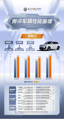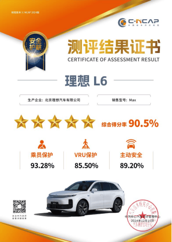 2024年12月10日,2024版中国新车评价规程(C-NCAP)首批测评结果公布,作为首个参与测评的车型,理想L6以综合得分率90.5%获得C-NCAP测评五