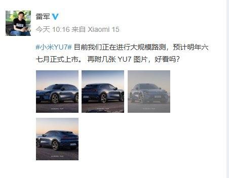 每经AI快讯,12月10日,雷军在微博发文称小米YU7目前正在进行大规模路测,预计明年六七月正式上市。 每日经济新闻 (责任编辑:董萍萍 )