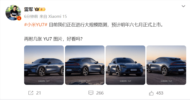 每经AI快讯,12月10日,雷军在微博发文称小米YU7目前正在进行大规模路测,预计明年六七月正式上市。每日经济新闻