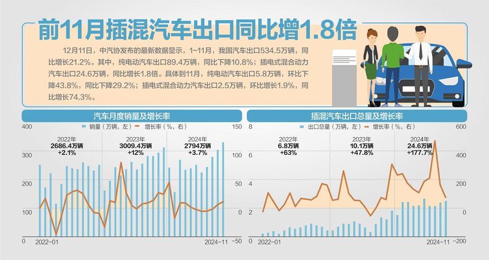 每经记者 李 星每经编辑 范文清 12月11日,中汽协发布的最新数据显示,11月,我国汽车产销分别完成343.7万辆和331.6万辆,环比分别增长14.7%和8.6%,同比分别增长11.1%和11.7%,月度产销创历史新高。 中国汽车工业协会副秘书长陈士华表示,11月,汽车市场热度延续,以旧换新政策效果继续显现,购车需求进一步释放。伴随政策累积效应不断显现,各地及企业促销活动持续发力,加之最后一月收尾冲刺,预计12月我国汽车销量也将超300万辆,全年总销量有望超3100万辆。 乘用车市场持续走强 在政策拉动下,我国乘用车产销在11月首次突破了300万辆。中汽协数据显示,11月,我国乘用车产销分别完成310.9万辆和300.1万辆,环比分别增长14.9%和9%,同比分别增长14.9%和15.2%。 细分来看,中国品牌乘用车共销售205.1万辆,同比增长31.8%,销量占有率为68.3%,较上年同期上升8.6个百分点。在主要外国品牌中,与上月相比,五大主要品牌销量均呈两位数增长;与上年同期相比,除法系品牌销量呈两位数增长外,其他四大主要品牌销量均呈不同程度下降。 相较于乘用车市场的持续走强,商用车表现却较为低迷。中汽协数据显示,11月,我国商用车产销分别完成32.7万辆和31.5万辆,环比分别增长12.8%和5.6%,同比分别下降15.7%和13.9%。在商用车主要品种中,与上月相比,客车和货车产销均呈不同程度增长;与上年同期相比,客车产销小幅下降,货车产销呈两位数下降。 对于2024年以来商用车市场持续疲软的原因,陈士华分析称,这主要体现在三个方面:一是房地产等市场的基础投资建设数量下降;二是经济压力大,终端运价低,商用车更新速度较慢;三是在国家促消费政策中,对于商用车的支持力度还不够。这也造成我国商用车市场国内市场表现低迷,主要靠出口拉动。 数据显示,1~11月,商用车国内销量为267.9万辆,同比下降9.9%;商用车出口82.6万辆,同比增长19.3%。其中,11月,商用车国内销量24.4万辆,同比下降15.8%;商用车出口7.1万辆,同比下降6.6%。 “多方因素影响下,2024年我国商用车销量规模或难达年初预测的400万辆。”陈士华称。 新能源车产销两旺 11月,我国新能源汽车月度产销再创历史新高,双双突破150万辆。中汽协数据显示,11月,我国新能源汽车产销分别完成156.6万辆和151.2万辆,同比分别增长45.8%和47.4%,新能源汽车新车销量占汽车新车总销量的45.6%。“这主要得益于插电混动汽车的拉动。”陈士华解释称。 细分来看,11月,我国纯电动汽车销售90.8万辆,同比增长29.3%;插电混合动力汽车销量为60.4%,同比增长86.8%。陈士华预计,今年最后一个月我国新能源汽车将销售140万辆或150万辆,全年总销量将在1280万辆左右。 作为拉动我国汽车销量增长的另一动力,汽车出口在11月也出现了微增长。数据显示,11月我国汽车出口49万辆,环比下降9.5%,同比增长1.6%。1~11月,我国汽车出口534.5万辆,同比增长21.2%。 细分来看,插电式混合动力汽车出口增速已远超纯电动汽车。数据显示,1~11月,我国纯电动汽车出口89.4万辆,同比下降10.8%;插电式混合动力汽车出口24.6万辆,同比增长1.8倍。 陈士华预计,如果12月我国汽车出口能保持在50万辆左右,2024年全年总出口量将达到580万辆,高于年初预测的550万辆。 中汽协方面呼吁,相关促汽车消费政策明年继续延续并及早出台,以避免市场出现太大的波动。 (责任编辑:王治强 HF013)
