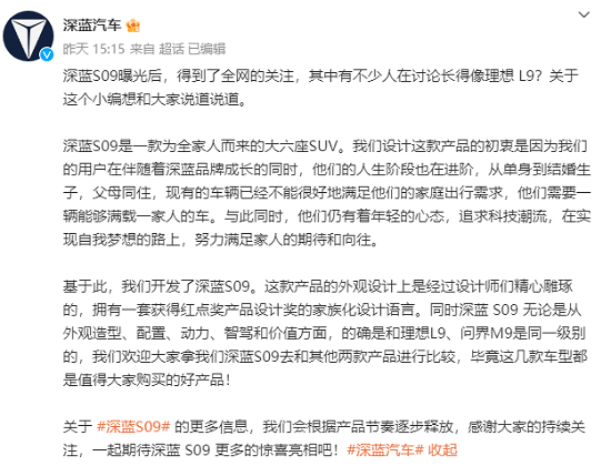 “背刺”车主风波未平,深蓝汽车再陷新车涉嫌抄袭“绯闻”。其中,长安牌产品型号为SC6522AAA6HEV的车型,在外观和尺寸方面与理想L9有相似之处,被外界质疑涉嫌抄袭。”当天晚些时候,深蓝汽车在微博回应称,深蓝S09 ...