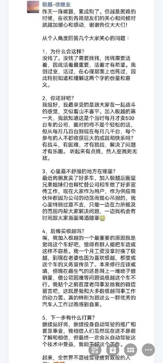 同辰科技讯 12月12日上午消息,极越CEO夏一平承认公司正遇到困难,需要立即调整,数位极越主播已经在官方直播间求职。 极越汽车公关负责人徐继业在朋友圈称,公司近期出现的一些情况主要原因是没钱了,需要找钱生存下去,活着才有希望。 徐继业表示,心里最不舒服的地方是最近向朋友卖了好多车。“现在大家作为用户,作为供应商伙伴都因为公司的动荡而提心吊胆的,我心里特别过意不去,只能一边在力所能及的范围内帮大家解决问题,一边找机会有时间跟大家当面喝酒赔罪。” 他表示,自己下一步就是“继续站好岗,继续投身自动驾驶的推广和普及事业”。 (责任编辑:宋政 HN002)