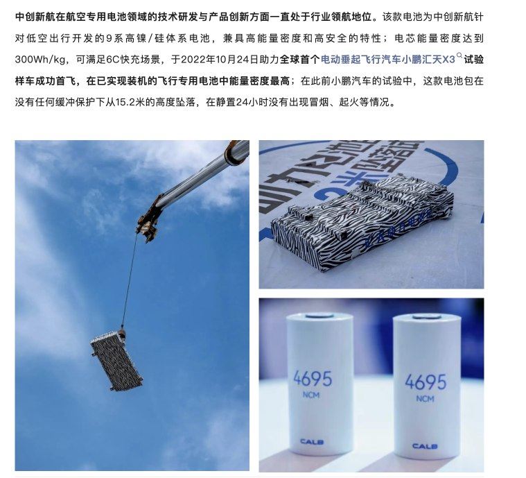 根据中创新航微信公众号11月16日文章,小鹏汇天分体式飞行汽车“陆地航母”使用的是中创新航针对低空出行开发的9系高镍/硅体系电池,兼具高能量密度和高安全的特性,电芯能量密度达到300Wh/kg,可满足6C快充场景。关 ...