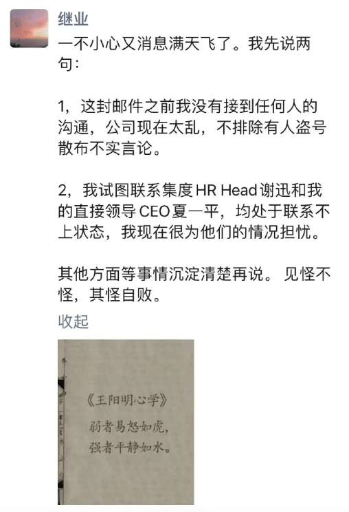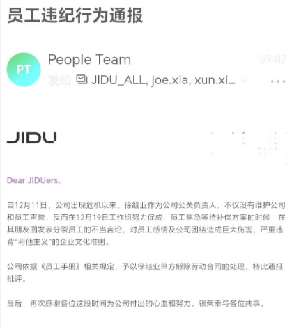 据第一财经报道,12月20日上午,极越汽车通过邮件发布“员工违纪行为通报”。极越汽车表示,公司出现危机以来,公关负责人徐继业不仅没有维护公司和员工声誉,反而在12月19日工作组努力促成、员工焦急等待补偿方案的时候,在其朋友圈发表分裂员工的不当言论,对员工感情及公司团结造成巨大伤害,严重违背“利他主义”的企业文化准则。公司依据《员工手册》相关规定,予以徐继业单方解除劳动合同的处理,并通报批评。 随后,一张备注为“继业”的截图在网上流传,其在朋友圈表示,“这封邮件之前我没有接到任何人的沟通,公司现在太乱,不排除有人盗号散布不实言论。我试图联系集度HR Head谢迅和我的直接领导CEO夏一平,均处于联系不上状态,我现在很为他们的情况担忧。” 极越汽车事件近期闹得沸沸扬扬。 12月11日,该公司多部门宣布就地解散。随后,员工社保断缴、CEO被围堵的消息冲上热搜。12月12日,多个注册名称为“极越销售门店”的抖音账号开启“摆烂式”直播。 12月13日,极越汽车的股东吉利和百度发表联合声明,称作为股东,将积极协助集度管理层妥善处理相关事宜:第一时间解决员工社保缴纳、离职员工补偿问题。 12月19日,极越员工善后方案出炉。文件显示,在相关政府部门指导和见证下,建立监管共管账户代极越为员工支付相关费用,垫付资金由百度、吉利打入。 善后方案具体涉及四个方面: 1、经济补偿:将按照“N+1”的标准提供经济补偿。 2、工资与社保、公积金:工资结算至2024年12月20日。 3、特殊安置:对于处于“三期”(孕期、产期、哺乳期)、工伤、医疗期的员工,原则上保留工作岗位直至相应情形结束。 4、履行方式与时间:在相关政府部门的指导和见证下,建立监管共管账户,代集度公司于2025年1月20日之前支付工资及经济补偿,垫付资金由百度、吉利打入。