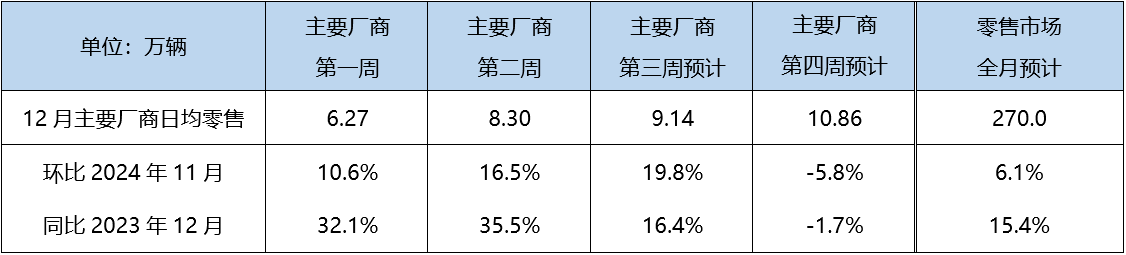 日前,乘联分会发布12月销量预测数据,预计该月狭义乘用车零售总市场规模约为270万辆,同比去年增长14.8%,环比上月增长11.4%,新能源零售预计可达140万辆,渗透率约51.9%。 市场持续升温,全年总量预计将达2295.7万辆 近几月,乘用车市场上升态势明显。 其中11月,在报废更新、以旧换新双政策的大力拉动下,乘用车市场维持高平台增长。数据显示,11月狭义乘用车零售242.4万辆,同比增长16.6%,环比增长7.2%,市场保持环比快速增长。 进入12月,乘用车市场继续升温。 乘联分会指出,随着年末临近,各企业发力冲击年度目标,汽车市场不断升温,即将在12月底截止的“双新”补贴对车市也会在到期前对车市带来一波强力拉动,另外由于2025年春节时间在1月底,一部分春节前购车需求也会在今年12月提前释放,“以上各因素叠加,共同促进今年12月购车需求增加。” 图片来源:乘联会 分周来看,12月车市开局表现强劲。第一周乘用车日均零售6.27万辆,同比增长32.1%,环比增长10.6%;第二周车市继续升温,日均零售达8.3万辆,同比增长35.5%,环比增长16.5%;第三周预计日均零售9.14万辆,同比增长16.4%,环比增长19.8%。 不过第四周,预计乘用车日均销量为10.86万辆,同比下滑1.7%,环比下滑5.8%。对此,乘联分会表示,由于“双新”补贴政策年底到期,今年12月消费节奏相较同期前移。 由此,该机构初步推算,11月狭义乘用车零售总市场规模约为270万辆,同比增长14.8%,环比增长11.4%,新能源零售预计可达140万,渗透率约51.9%。 结合此前数据,今年1-11月狭义乘用车累计零售量为2025.7万辆,因此今年全年狭义乘用车累计零售量预计将达到2295.7万辆,较2023年的2,169.9万辆增长约6%,符合乘联分会本月初给出的预期。 具体到新能源板块来看,今年1-11月新能源乘用车市场零售量达959.4万辆,因此今年全年新能源乘用车市场零售量预计将达到1099.4万辆,较2023年的773.6万辆增长约42%。 政策定调,2025年乘用车市场依旧值得期待 按照乘联分会的说法,2024年是车市消费的特大年,2025年属于车市消费的特小年。 具体来讲,2025年春节在1月28日,较2024年早13天,叠加企业、税务、车管所等的设备维护和假期安排,导致部分春节前购车在2024年底完成。由此预计今年头部企业的销量完成率较好。 基于此,乘联分会预计,12月部分厂商销量转移至明年1月的规模很大,对岁末年初的销量有很好的平衡效果。 图片来源:智己汽车 行业周知,今年车市的良好表现,离不开报废更新、以旧换新双政策的大力拉动。 乘联分会指出,2024年的国家报废更新和以旧换新政策效果很好,估计今年报废更新近300万辆,以旧换新近400万辆,合计近700万辆总补贴量。预计以旧换新和报废更新的合力拉动车市增量在150万辆以上,带来2400亿元的销售额增长。由此带来的税收和利润的增长也是很好的反哺政策支出。 也因此,该机构此前便表示,期待国家能够提早明确接续补贴政策,及早稳定消费心态,实现消费的平稳可持续。“考虑到2025年的年初的小年压力,期待1月就开始实施针对首购群体的燃油车车购税减半政策,平衡换购群体和首购群体购车的政策的受益,让中低收入的首购群体买车也能享受到政策优惠。” 而在12月11日至12日,中央经济工作会议明确指出,将“大力提振消费、提高投资效益,全方位扩大国内需求”列为2025年九大重点任务之首,并要求加力扩围实施“两新”政策。 同时,会议上还提出,要大力提振消费,提高投资收益,全方位扩大国内需求,这将增强消费者对于汽车市场的信心,有利于消费者购买意愿的提升。 除此之外,会议还明确了要综合整治“内卷式”竞争,规范地方政府和企业行为,有利于为汽车产业创造更加开放、透明、公平的市场环境。 由此来看,2025年的乘用车市场,依旧值得期待。 (责任编辑:王治强 HF013)