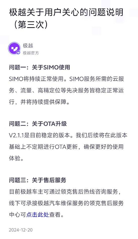 新浪科技讯12月20日下午消息,极越今日在App发布《极越关于用户关心的问题说明》。其中提到,SIMO将持续正常使用。SIMO服务所需的云服务、流量、高精定位等先决服务皆稳定正常运行,并将持续提供保障;关于OTA升级, ...