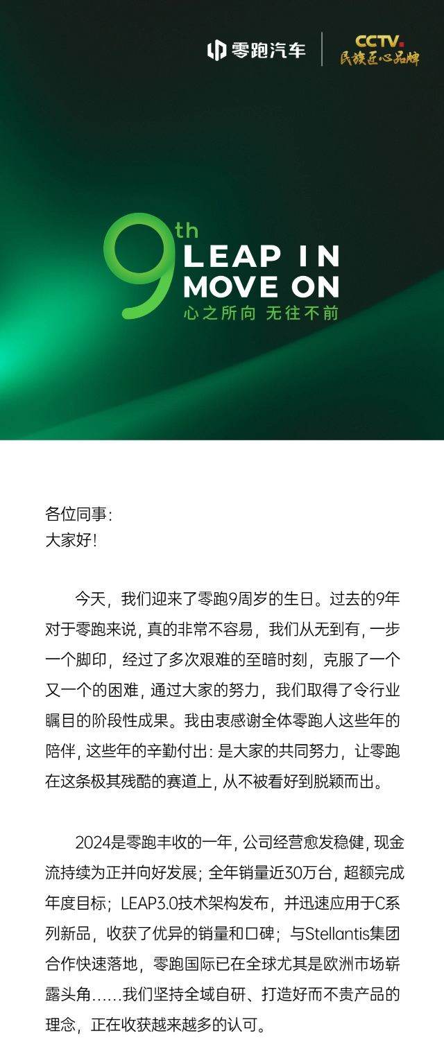 同辰科技讯 12月24日下午消息,零跑创始人、董事长、CEO朱江明今日发文宣布,2024年,零跑汽车全年销量近30万台,超额完成年度目标。 朱江明指出,未来三年至关重要,零跑已经进入决赛圈,竞争对手不再仅仅是“新势力“,而是真正的世界级的主流品牌。“市场环境的变化依然非常剧烈,需要我们有更强的自身能力、更敏捷的反应速度才有可能真正达成目标。” 朱江明表示,即将到来的2025年,希望公司围绕以下几个重点一起努力: 1、提升品牌价值:擦亮“让卓越触手可及”的品牌价值,让追求卓越成为我们每一个人对自己的要求强化“幸福感”的情感共鸣,坚持以用户为中心,打造好而不贵的产品和充满温度的服务。把最真实的零跑通过每个零跑人的一言一行传递给用户。 2、技术创新、技术降本:保持在技术层面的领先性是零跑的安身立命之本。过去两年我们通过“四叶草”中央集成式电子电气架构、CTC电池底盘一体化等创新型的技术,极大地提升了C系列的产品竞争力。有技术才有未来,面向只会越来越激烈的市场竞争,卷技术要作为我们的优良传统保持下去。 2、保质保量打造爆品:明年我们全新的LEAP 3.5架构将要重磅发布,基于LEAP3.5架构的全新B系列,极具市场竞争力,有望实现比C系列更进一步的商业成功。我们必须在生产上守住每一个关键节点,保质保量实现交付。还必须在营销操盘上充分集成,把我们的产品优势讲全面、讲明白。 3、加速国际化:中国新能源产业在国际上的竞争优势已经非常明显。通过11月份在欧洲市场的走访我也感受到了海外的巨大市场潜力。我们要充分协同Stellantis集团,把握市场机遇,结合国内的成功经验和海外的优势资源,加速在全球市场的销售、服务渠道拓展,加速包括B系列在内的新品导入,让全球用户都能体验到技术领先、好而不贵的产品。 “要做到以上几点,需要我们全体零跑人的共同努力,尤其是干部要以身作则,要时刻保持危机感,要时刻保持艰苦奋斗。干部要引领组织的变革提升效率、加强集成,持续引领团队向前,推动公司发展。”朱江明表示。(文猛) 来源:同辰网 (责任编辑:宋政 HN002)