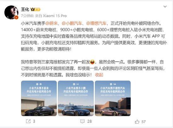 小米汽车宣布与蔚来、小鹏和理想汽车开展充电补能网络合作,允许1.4万个蔚来充电桩、9,000个小鹏充电桩和6,000个理想充电桩入驻小米充电地图。王化总经理说,小米汽车App将支持扫码充电,同时可以实时查看各品牌充电 ...