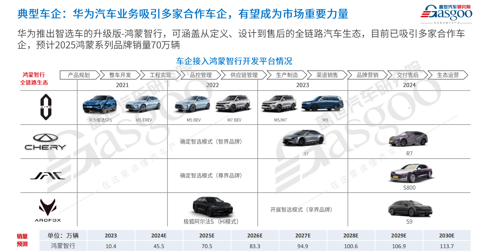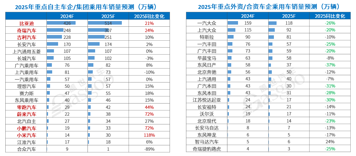 回首2024年的汽车行业,整体呈现蓬勃发展态势。盖世汽车研究院预测,我国乘用车市场将以5.9%的同比增幅收官,销量规模超过2700万辆。今年前11月,新能源乘用车市场销量已突破千万辆规模。车企出海再创新高,全年有望达到500万辆。 然而,繁荣背后是更加白热化的市场竞争。“油电”阵营间的价格战、车企间的技术对决和营销较量此起彼伏,价格战竞争范围更是从国内迅速蔓延至海外市场。在这场激烈角逐中,行业资源加速向头部车企集中,市场淘汰赛范围不断扩大。今年以来,高合、哪吒、远航等新势力相继遭遇重创,备受关注的极越汽车近期更是因融资失败倒下。与此同时,合资品牌整体陷入销量下滑的困境。 图片来源:特斯拉 随之而来的是关厂、裁员、缩减业务等一系列连锁反应。2024年,绝大多数车企都在内卷战中艰难前行。 转眼间,2025年就要到来。面对如此激烈的市场环境,明年的乘用车市场又会如何发展?油电竞争是否会持续升温?自主品牌与合资品牌的份额之争将进入何种阶段?…… 带着这些疑问,盖世汽车面向广大网友展开问卷调查,共收集3000余份有效回复。同时结合盖世汽车研究院的《2025年中国乘用车市场展望》报告,盖世汽车认为2025年乘用车市场将呈现十大发展趋势。 一、车市整体维持低增长 从我们用户调研数据来看,超八成的受访者对明年车市发展持积极态度,但预期增长谨慎。26%的用户预计2025年乘用车市场将保持1%~3%的同比增速,另有24%的用户看好3%~5%的增长空间,还有约两成用户认为销量将与2024年基本持平。 盖世汽车研究院预测,2025年以旧换新、地方补贴等政策有望延续,刺激车市需求保持增长。消息显示,中央经济工作会议已明确,明年要增加发行超长期特别国债,支持新能源汽车下乡和以旧换新政策持续推进。 2024年,以旧换新政策对汽车市场维持增长起到关键作用。专家预计2024年以旧换新政策将拉动乘用车销量增加200万~230万辆,约占总销量的8%~10%。 国务院发展研究中心市场经济研究所副所长王青则预测,2025年地方汽车补贴政策对汽车消费的刺激将会更大。 然而考虑到宏观经济、消费信心的波动以及市场需求的提前释放等问题,可能会削弱增长动能。盖世汽车研究院认为,2025年中国国产乘用车市场预计将保持约2%左右的增速,销量有望突破2800万辆大关。 二、新能源销量有望首超油车 2025年,我国乘用车市场有望迎来历史性转折点――新能源销量将首次超越传统燃油车。 盖世汽车研究院预测,2025年,中国新能源(600617)乘用车市场有望达到1570万辆,同比增长27%。市场份额将跃升至56%,较2024年上涨约10个百分点。与之相对的是,油车市场加速收缩,销量预计萎缩至1200余万辆。 这一预测背后,折射出的是整个汽车产业的结构性转型加快。但是,消费者对这一趋势的态度相对谨慎。在盖世汽车的问卷调查中,超40%的受访者认为明年新能源乘用车渗透率在50%~55%区间;有25%左右的用户对55%~60%的渗透率持乐观态度;仅一成用户认为渗透率将突破60%。 事实上,新能源全面超越油车的趋势已是可预见的现实。根据盖世汽车研究院预测数据库统计,截至2024年11月,新能源乘用车市场销量已达1077万辆,渗透率攀升至44%。更为显著的是,自6月以来,新能源乘用车零售渗透率已连续五个月突破50%,掌握市场主导权。 而在新能源赛道上,插混市场(含插电式和增程式)成长亮眼。今年前11个月,插混市场(含增程)销量同比激增85%,达452万辆,而纯电动车的销量增速则放缓至16%,总量为626万辆 很明显,两种动力类型的销量差距正在迅速缩小。当前,插混成为新能源汽车市场保持持续增长的关键驱动力。 盖世汽车研究院进一步预测,2025年,无论是自主品牌还是合资车企,都将在插混赛道展开激烈角逐,整体市场规模有望接近纯电动市场。 调研数据印证了这一趋势:26%的用户预期插混车型明年将占据新能源市场40%~50%的份额,较2024年有所增长;另有23%的用户认为其份额可能达到50%~55%。 三、自主品牌份额有望破70% 在中国汽车市场的生态版图中,2025年或将成为自主品牌加速重构竞争格局的重要之年。新能源赛道的先发优势,正在转化为自主品牌全面突破的战略动能。 盖世汽车研究院预测,2025年自主品牌有望将市场份额推进至70%以上,较当前增长约8个百分点,并成为车市增长的最主要驱动力。 然而,市场对这一判断依然保持谨慎。在调研数据中,多数用户认为自主品牌2025年的市场份额增长或将受限,难以突破70%的关口。另有约四分之一的受访者甚至预期自主品牌将维持现有64%左右的市场份额。 值得关注的是,车市竞争正在经历根本性的形态演变。盖世汽车研究院认为,未来汽车制造商的竞争格局将呈现四种主要形态:汽车制造商、生态品牌服务商、细分市场产品领先者和汽车代工商。这意味着,单一的制造能力已不再是制胜的关键。 在这场产业变革中,传统车企和新势力都在积极谋求突破。受益新能源和出口两大领域的规模化增长,多数自主品牌在2025年仍将延续增长态势。 传统车企中,比亚迪(002594)、吉利、长安等有望实现10%以上的同期增长。新势力阵营中,蔚来、小米、鸿蒙智行、小鹏等品牌前景同样令人期待。 四、出海本地化运营成为重要考量点 在全球汽车产业的发展进程中,中国正以前所未有的姿态书写属于自己的出海篇章。自2021年起,中国汽车出口就开