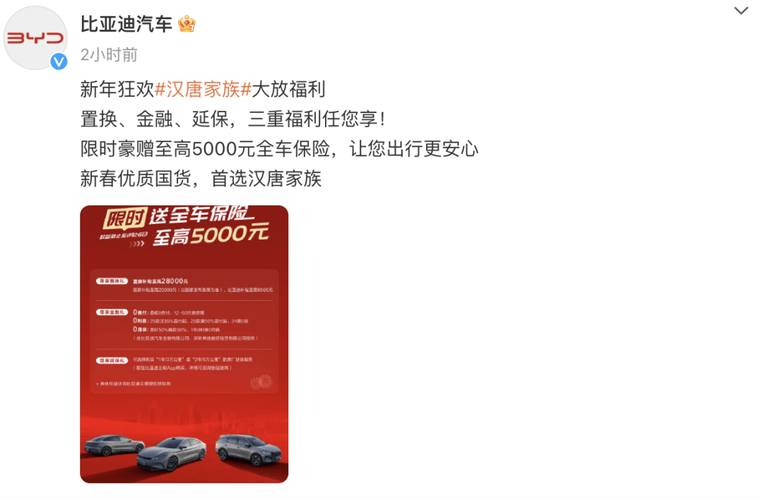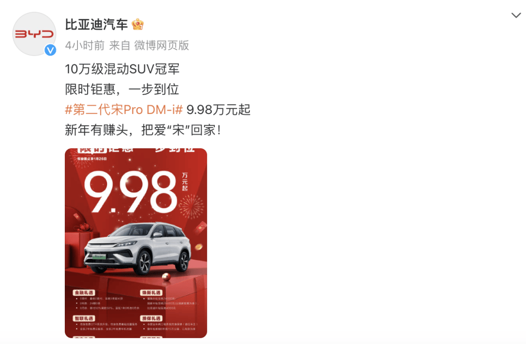 汽车行业的价格战从年初打到了年尾。 12月27日,“比亚迪(002594)汽车”官方微博发文称,即日起至2025年1月26日,对秦PLUS EV荣耀版限时优惠1万元,对第二代宋Pro DM-i也进行限时优惠活动,优惠后两款车型起售价均为9.98万元。并且,上述两款车型置换补贴最高分别为2.5万元和2.4万元。此外,比亚迪还针对汉唐家族推出了限时送至高5000元的全车保险活动。 此前在2月19日,比亚迪靠着起售价7.98万元的比亚迪秦PLUS荣耀版和驱逐舰05荣耀版打响了“龙年汽车价格战”的第一枪。据中国汽车流通协会乘用车市场信息联席分会(以下简称“乘联分会”)统计,2024年前11个月已经有195款汽车进行降价,超过2023年全年规模。 比亚迪持续引领价格战 据“比亚迪汽车”官方微博,即日起至2025年1月26日,对秦PLUS EV荣耀版限时优惠1万元,对第二代宋Pro DM-i也进行限时优惠活动,优惠后两款车型起售价均为9.98万元。 此外,2024年12月27日至2025年1月26日,购买汉唐家族车型,限时赠送至高5000元全车保险,并且可享受“0首付、0利息、0月供”福利和最高2.8万元的置换补贴(包括最高2万元的国家补贴和8000元的比亚迪补贴)。 可以看到,比亚迪此次降价和优惠活动集中于秦、宋、汉、唐等王朝网车型。2024年11月,比亚迪汽车销量达到50.68万辆,同比增长67.2%。其中,比亚迪王朝网销量达25.31万辆,占到了公司汽车总销量的49.95%,是比亚迪的汽车销量主力。 实际上,今年年初开始,比亚迪就多次向汽车市场投下“价格炸弹”。2月19日,比亚迪秦PLUS荣耀版、驱逐舰05荣耀版上市,起售价为7.98万元,实现了“减价不减量”,在10万元以下的汽车市场掀起价格风暴。3月1日,比亚迪又推出起售价10.98万元的宋Pro DM-i,进入了“电比油低”的新篇章。 到了11月,“比亚迪向供应商砍价”的事件引发关注,一封主题为《2025年比亚迪乘用车降本要求》的邮件显示:2025年,新能源汽车市场竞争将更加激烈,进入“大决战”“淘汰赛”。为增强比亚迪乘用车竞争力,比亚迪需要整个供应链共同努力、持续降本,要求相关供应商所供货产品从2025年1月1日起降价10%。 对此,比亚迪集团品牌及公关处总经理李云飞回应称:“与供应商的年度议价,是汽车行业的惯例。我们基于规模化大量采购,对供应商提出降价目标,非强制要求,大家可协商推进。” 东兴证券研报表示,新一年的汽车价格战将提前开打,汽车主机厂正纷纷将成本压力转嫁给上游。 而降价的“弹药”正来源于比亚迪的成本控制能力和利润的高韧性。在2024年多次降价的情况下,前三季度比亚迪实现营业收入5022.51亿元,同比增长18.94%,净利润达252.38亿元,同比增长18.12%。 招银国际研报认为,比亚迪的利润将在2025年继续保持韧性,因为其强大的降本能力,也可能将引领新一轮的行业价格战。 汽车降价规模达2022年两倍 除了比亚迪之外,特斯拉等车企也在延续降价措施。11月25日,特斯拉上线尾款立减活动,从11月25日到12月31日期间,特斯拉Model Y后轮驱动版及长续航全轮驱动版车型尾款立减10000元,售价23.99万元起,同时还能选择5年0息金融方案。 据乘联分会数据,2024年前11个月降价规模195款,已经超过2023年全年的150款的规模,也大幅超越了2022年的95款的降价总规模。 从不同种类汽车来看,前11个月插电混动车型新车平均降价1.5万元,降价幅度达8.5%;纯电动车型新车平均降价2万元,降价幅度达到10%;增程混合动力车型新车平均降价1.58万元,降价幅度达6.1%;混合动力车型新车平均降价1.05万元,降价幅度达到4.3%。而常规燃油新车型和降价车型平均降价1.34万元,平均降价幅度为7.3%。 乘联分会秘书长崔东树表示,从降价节奏来看,2023年的降价总体相对比较均衡,但2024年的降价在3月份和4月份都达到了超强的程度,2月份有24款车型降价,3月份有53款车型降价,4月份有43款车型降价,2―4月的降价车型数量相对于历史来看也是一个惊人的水平,5月、6月、10月降到较低水平,体现了降价潮暂时结束。 价格战对汽车零售市场也带来了较大影响。中国汽车流通协会专家委员会成员李颜伟表示,若以去年1月市场折扣和新车成交均价为基准进行计算,今年前11个月整体汽车零售市场损失达1776亿元,同比增长931亿元。而对比来看,今年前11个月国内乘用车累计销量为2078万辆,同比增长8.5%。 在汽车行业持续降价的情况下,汽车库存得到了明显消化。乘联分会数据显示,截至2024年11月底,全国乘用车库存为320万台,较2023年11月下降72万台,较2022年11月降低74万台。 崔东树表示,2024年11月底的乘用车库存与未来销量综合预估的现有库存支撑未来销售天数在50天,相对于2022年11月的72天和2023年11月的62天,均下降较大,乘用车行业总体库存压力不大。 本文首发于微信公众号:证券时报。文章内容属作者个人观点,不代表西瓜财经立场。投资者据此操作,风险请自担。 (责任编辑:宋政 HN002)