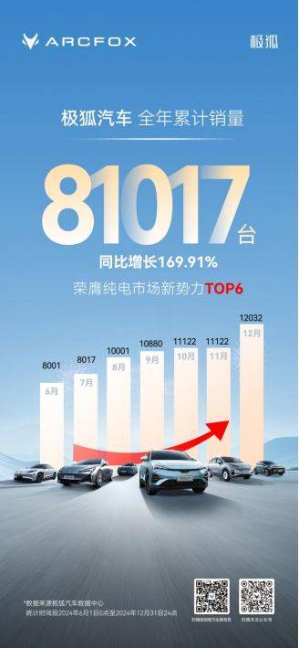 极狐支棱起来了 说一个品牌起势了,支棱起来了,要对比着看,没有对比就没有伤害,我们可以看看五个“极”字辈儿在11月份的销量表现。 若论销量的绝对值,一目了然。但这里我们说的是势能,也就是数字背后曲线上扬的犀利角。2024年,极狐低调开局,一路向上。特别是进入下半年,月销稳定在11000台以上,全年销量达成81017台,同比增长169.91%,连续3年实现销量翻番。2024最后一个月,极狐销量达到12032台,再创新高。这样的势能别说其他几位“极”字辈儿比不了,就是放在全部新能源品牌中,也是含金量十足。一年下来,极狐位居新势力纯电市场TOP6,更是国企纯电品牌TOP1。再细分一下的话,极狐在北京、镇江、连云港(601008)等城市,月销量进入纯电排名前二;在重庆、南京、泰州等城市,月销量也位列纯电三甲。进步是肉眼可见的跨越,而非小碎步的前移。 要知道,极狐给人的印象,从一开始就是“闷声造车”,销量不温不火。然而,谁能想到,默默无闻的极狐突然一鸣惊人,连续数月销量破万,难怪有人说:极狐和过去不一样了,这是从慢行的“辅路”,直接开上了高速快车道,“提速”也太快了。