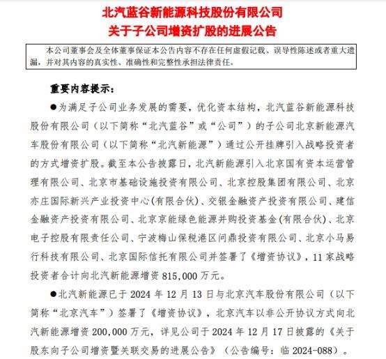 极狐或许就是那只“潜力股” 作为北汽“嫡系”,极狐在资金、技术、人才等方面拥有强大的底气。北汽“当家人”张建勇也在多个场合表示,作为北汽集团的1号工程,集团将坚定不移地支持极狐发展,未来将投入1000亿资源,重点赋能极狐的技术升级和产品迭代,ALL IN极狐。 对于这些表态,公众可能会淡淡地说,哪个家长不希望自家孩子好呢?但如果很多外人也看好你,是不是能说明,你可能真的就是那块料,起码具备成为最棒那一个的潜质。这不,12月25日,北汽蓝谷(600733)发布公告,11家战略投资者向北汽新能源增资81.5亿。在此之前,北京汽车已向北汽新能源增资20亿元。至此,北汽新能源累计增资已达101.5亿元,这势必为极狐品牌接下来的发展注入强劲动能。