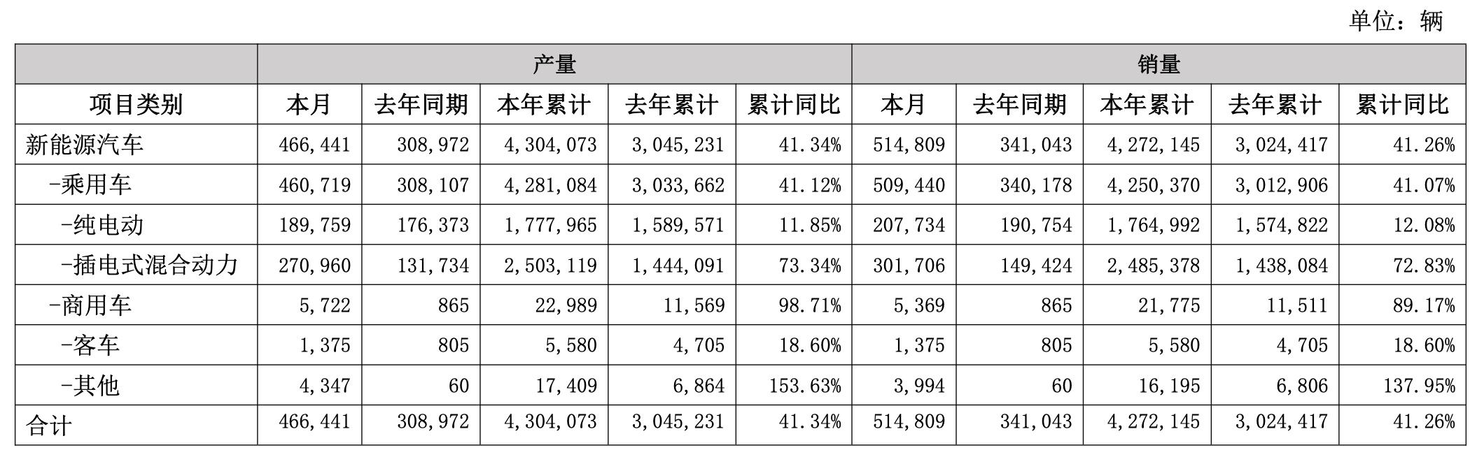 【大河财立方消息】1月1日,比亚迪披露2024年12月份产销快报 。 2024年12月,比亚迪新能源汽车产量466441辆;全年产量4304073辆,同比增长41.34%。12月比亚迪新能源汽车销量514809辆;全年销售4272145辆,同比增长41.26%。 实习编辑:陈星冉 | 审核:李震 | 监审:万军伟 (责任编辑:郭健东 )