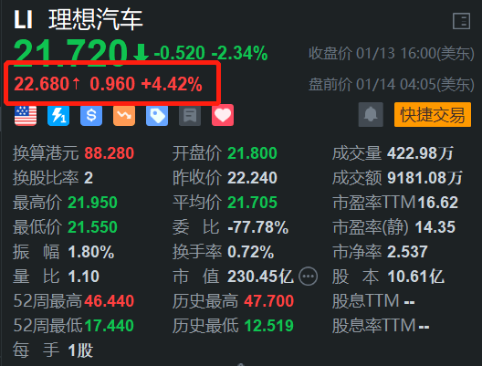 理想汽车(LI.US)美股盘前涨4.4%,H股今日收涨超3%。消息上,理想汽车在2025年第2周(1月6日至1月12日)的周销量达到0.76万辆,成功反超小鹏汽车,重回新势力销量榜第一的位置。此外据悉,理想汽车在厦门成立销售服务公司,含二手车经纪业务。(格隆汇) (责任编辑:宋政 HN002)