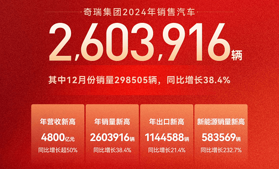 2024年激烈的竞争充斥整个汽车行业,但奇瑞集团却表现的游刃有余,不仅在销量上取得了历史性的突破,还是全行业唯一实现新能源、燃油车、海外出口、国内市场“四赛道”全面增长的车企。2024年,奇瑞集团销量达到260. ...