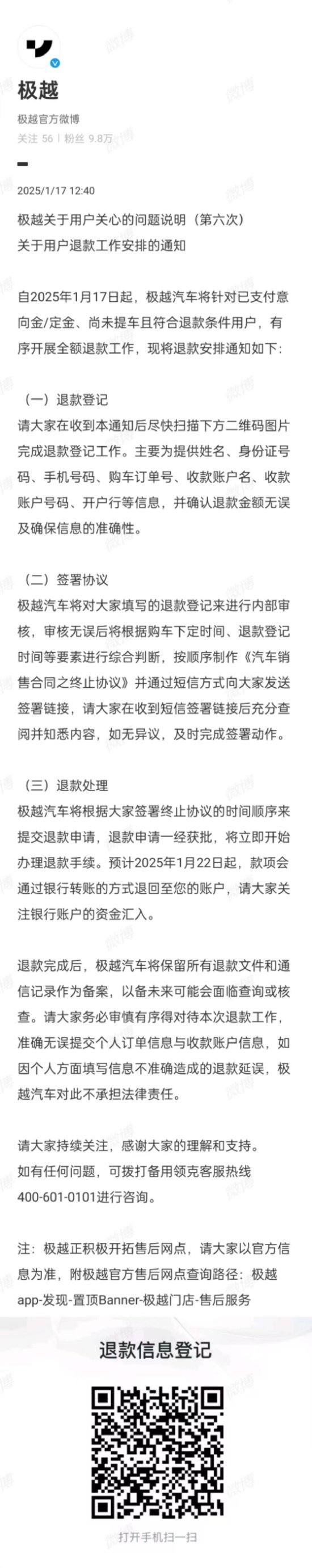 极越官方微博宣布从今日起将针对已支付意向金/定金、尚未提车且符合退款条件的用户有序开展全额退款工作,预计在1月22日前完成退款。