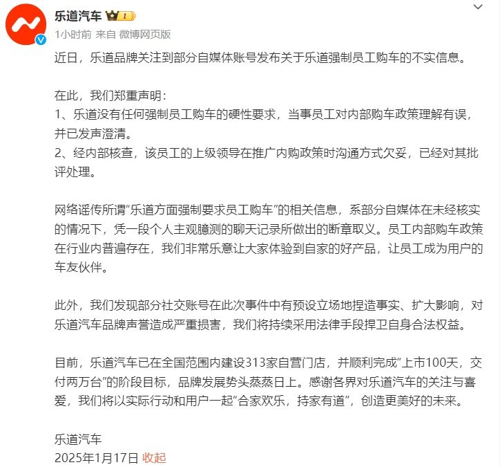针对网上流传的“乐道强制要求员工购车”一事,1月17日,乐道汽车通过微博发布声明称,乐道没有任何强制员工购车的硬性要求,当事员工对内部购车政策理解有误,并已发声澄清。经内部核查,该员工的上级领导在推广内 ...