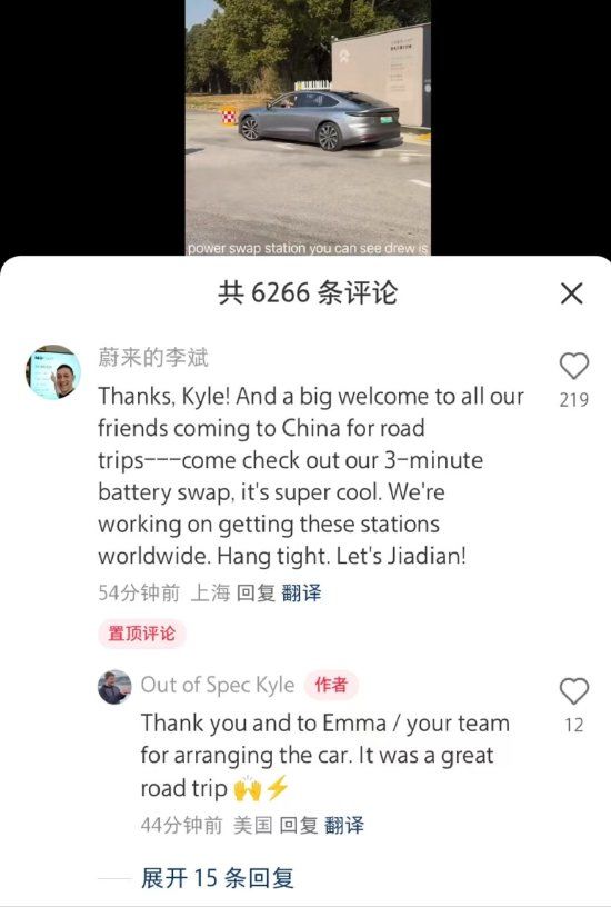 蔚来创始人、董事长、CEO李斌在小红书上表示,欢迎自驾游来中国的朋友来体验蔚来的3分钟换电池。他还透露,蔚来正在全球各地建设充电站。