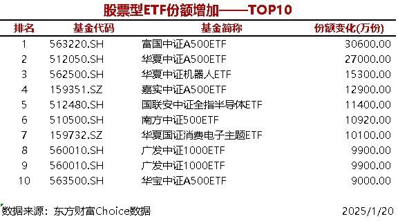 每经AI快讯,据东方财富Choice数据统计,昨日共7只股票型ETF当日份额增加超1亿份,富国中证A500ETF增加3.06亿份,华夏中证A500ETF增加2.7亿份。