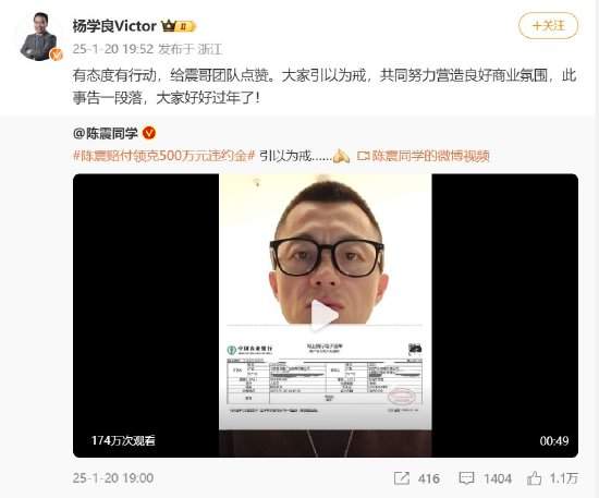 新浪科技讯1月21日上午消息,汽车博主陈震近日在微博发文 “陈震赔付领克500万元违约金,引以为戒。吉利控股高级副总裁杨学良转发该微博并表示 “有态度有行动,给震哥团队点赞。大家引以为戒,共同努力营造良好商业 ...