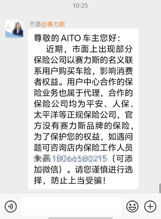 同辰科技讯 1月21日午间消息,赛力斯客服向车主发送消息称,近期,市面上出现部分保险公司以赛力斯的名义联系用户购买车险,影响消费者权益。用户中心合作的保险业务也属于代理,合作的保险公司均为平安、人保、太平洋等正规保险公司,官方没有赛力斯品牌的保险。